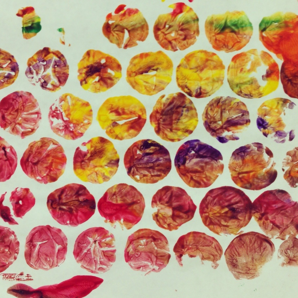 i appreciate the challenge of finding activities where the process is the priority but there is also a take home product. printing is perfect! last week we painted on bubble wrap taped to a table with hands and foam brushes and then made prints of the painted bubble wrap.