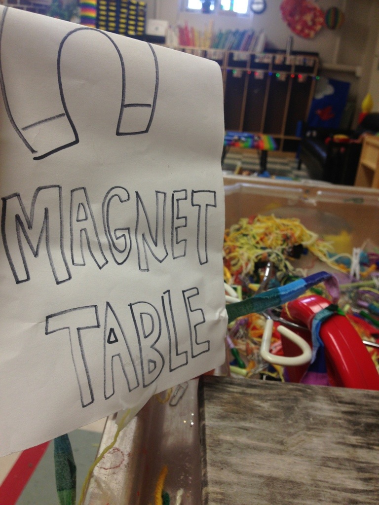 I can’t express enough the benefits of a drop ceiling for times like these. hanging magnets from string (or yarn or fabric strips) tucked in the tiles adds so much fun…and a bit of a brain balance as there is a lot of looking up and down.