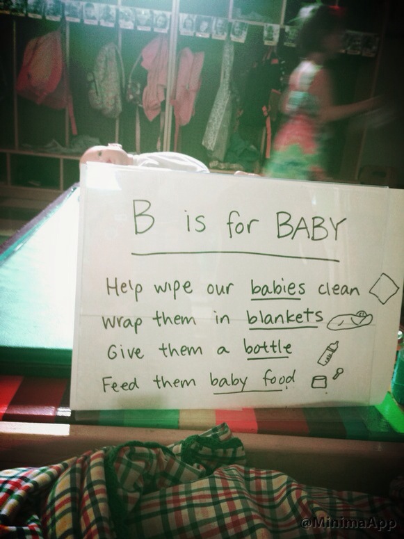 we had a little “baby corner” with a few extras: wipes, empty baby food jars, tiny spoons, board books, rocking chairs…
