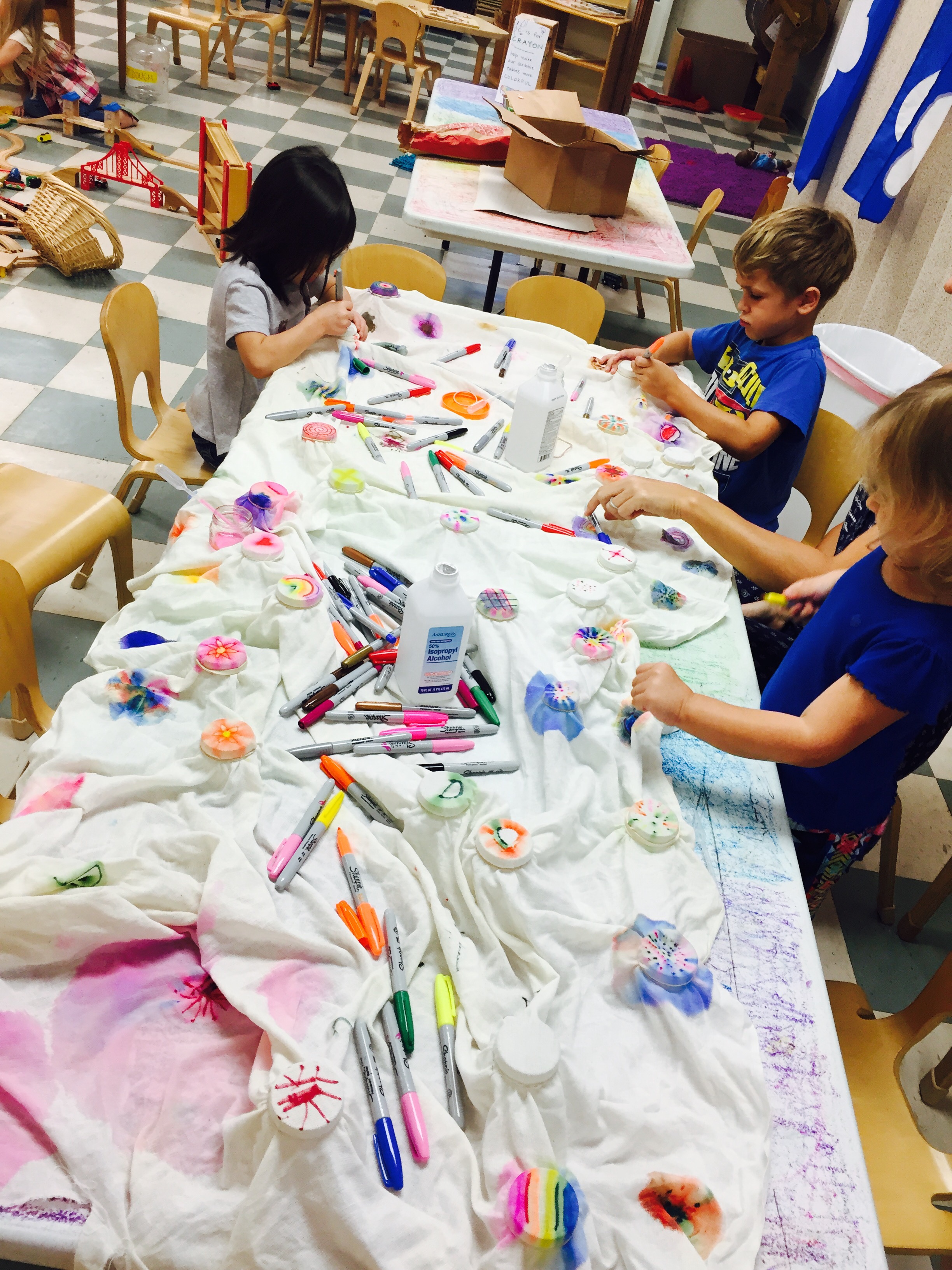 one of our older classes did the permanent marker and rubbing alcohol tie dye technique. ms. cathy and i had as much fun as they did.