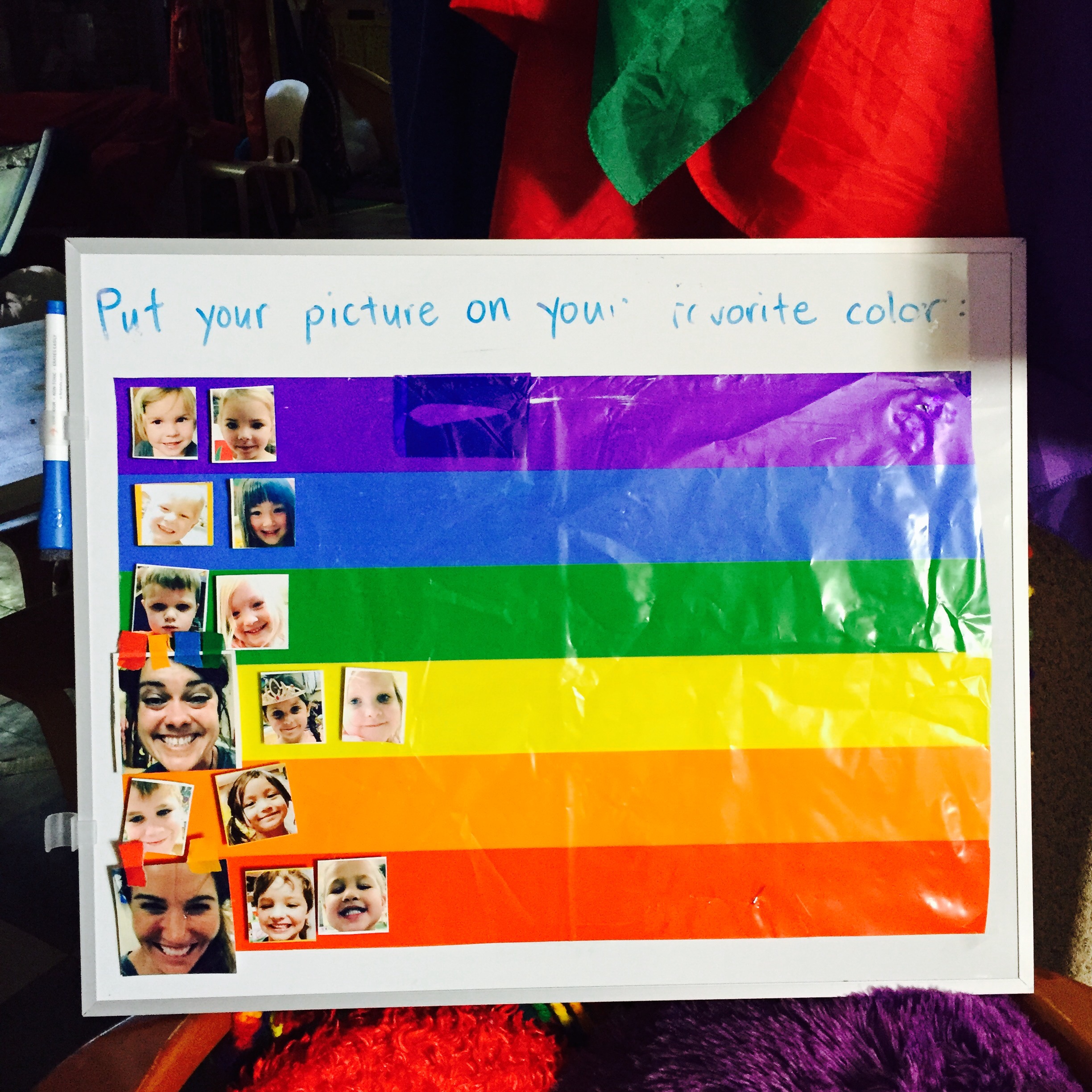 we move our pictures (with magnets on back) from our class pockets to the (magnetic) picture board every day. during c week we had a rainbow color chart to place our pictures on our favorite color available.