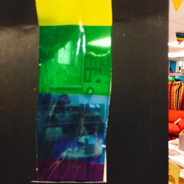 we used rainbow cellophane (and old tablecloth i found) and old black file folders (thanks, angie) to make color viewers.