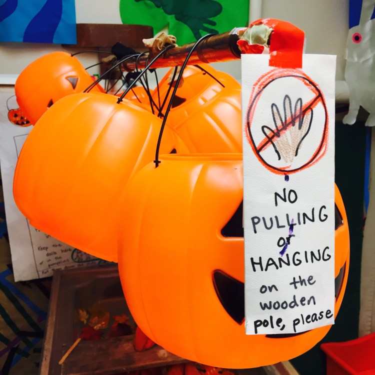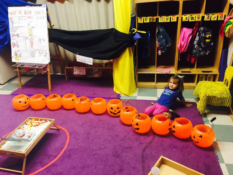 when our pumpkin patch moved to the tub table to make room for our “crawl low under smoke” corner, the big pumpkins still found their way back to the purple rug.