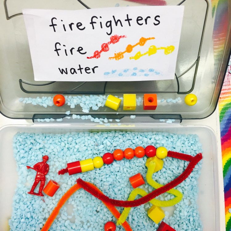 the F tray had blue stones for water, a couple firefighter figures and beads/pipe cleaners to thread.