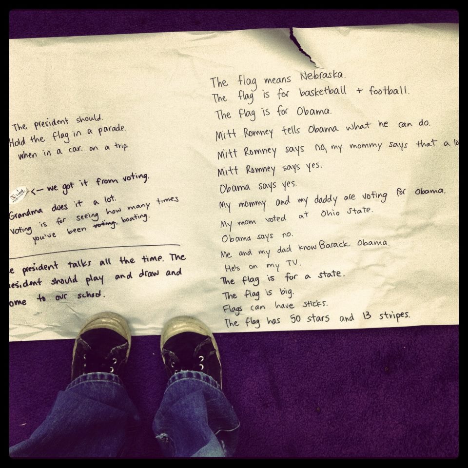 As is our practice, teachers will not advocate for a particular candidate. We will discuss the facts of the election process, allowing children to voice opinions and questions in our traditional “what we know” style. These ideas will be recorded on paper and shared with families so you can continue the conversation at home. Here is a sampling from 2012 (click here for full post):