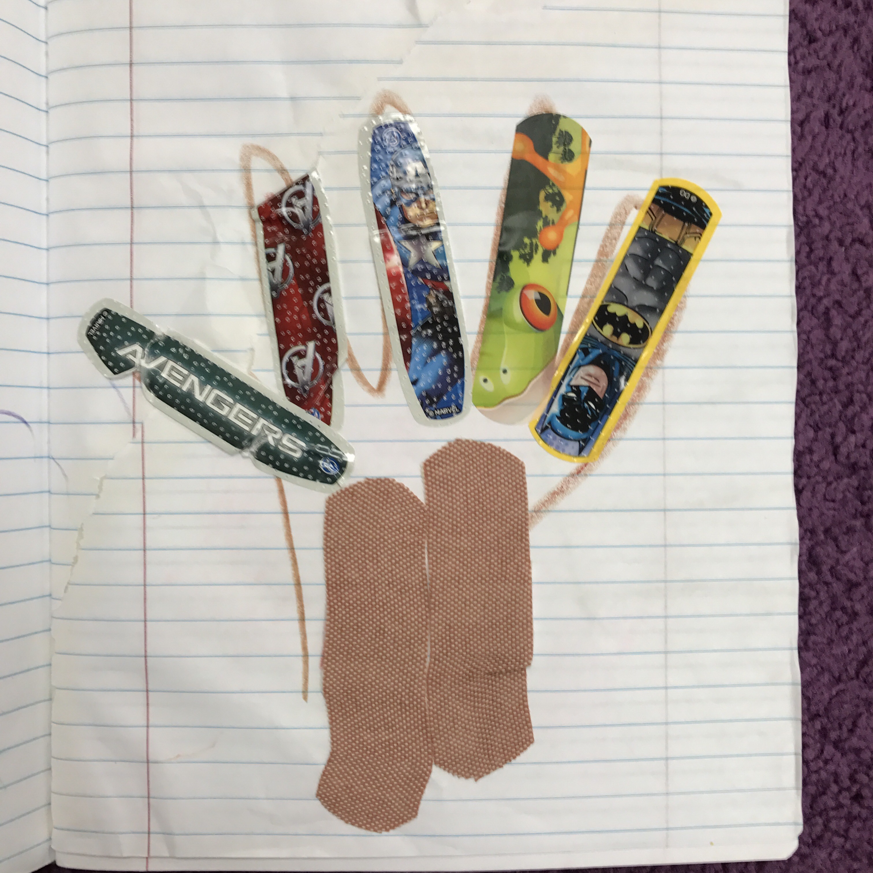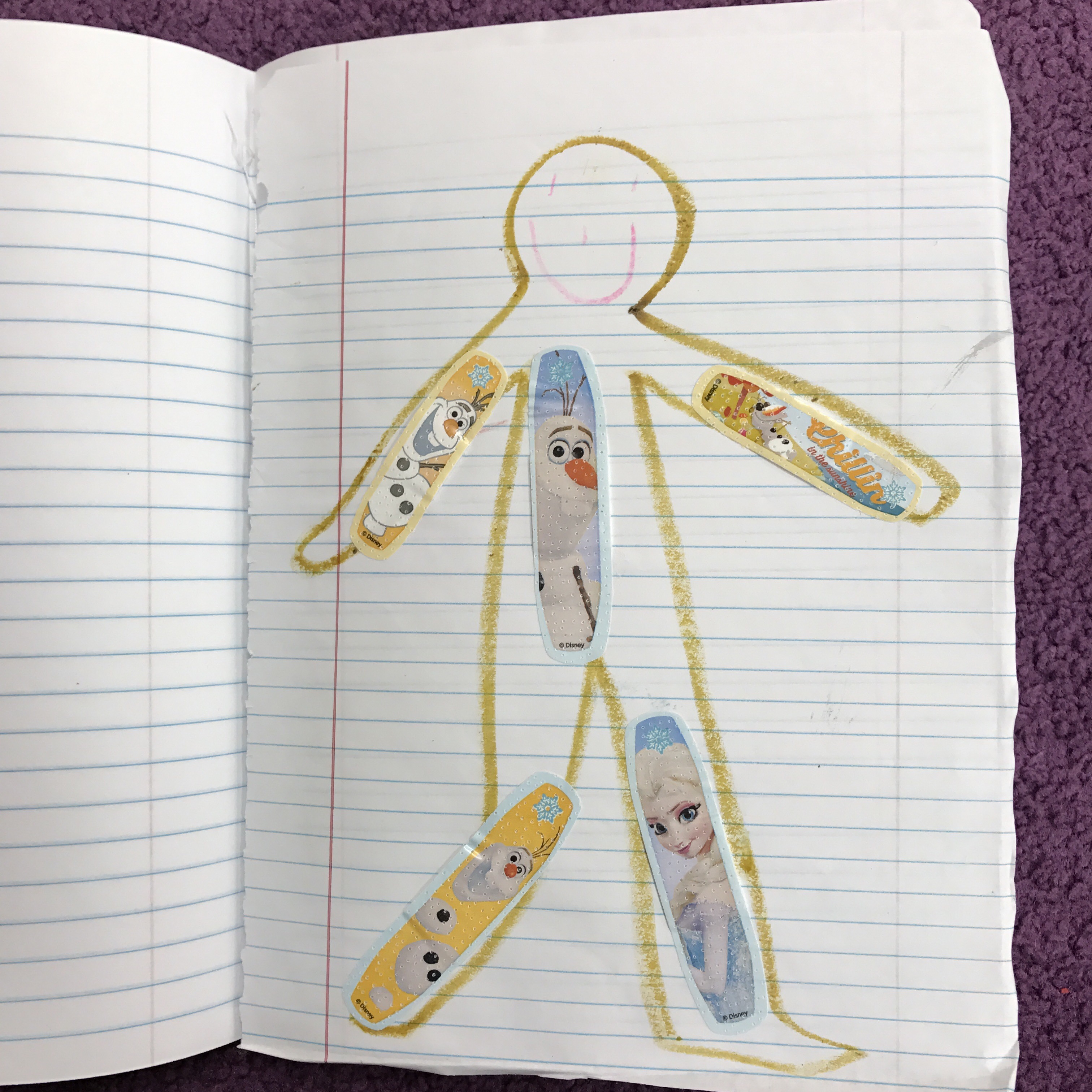 body shapes, red crayon marks for blood and band aids to go on top. imagine the conversations and the fine motor work!