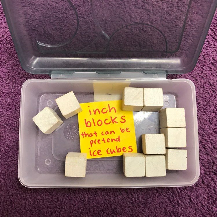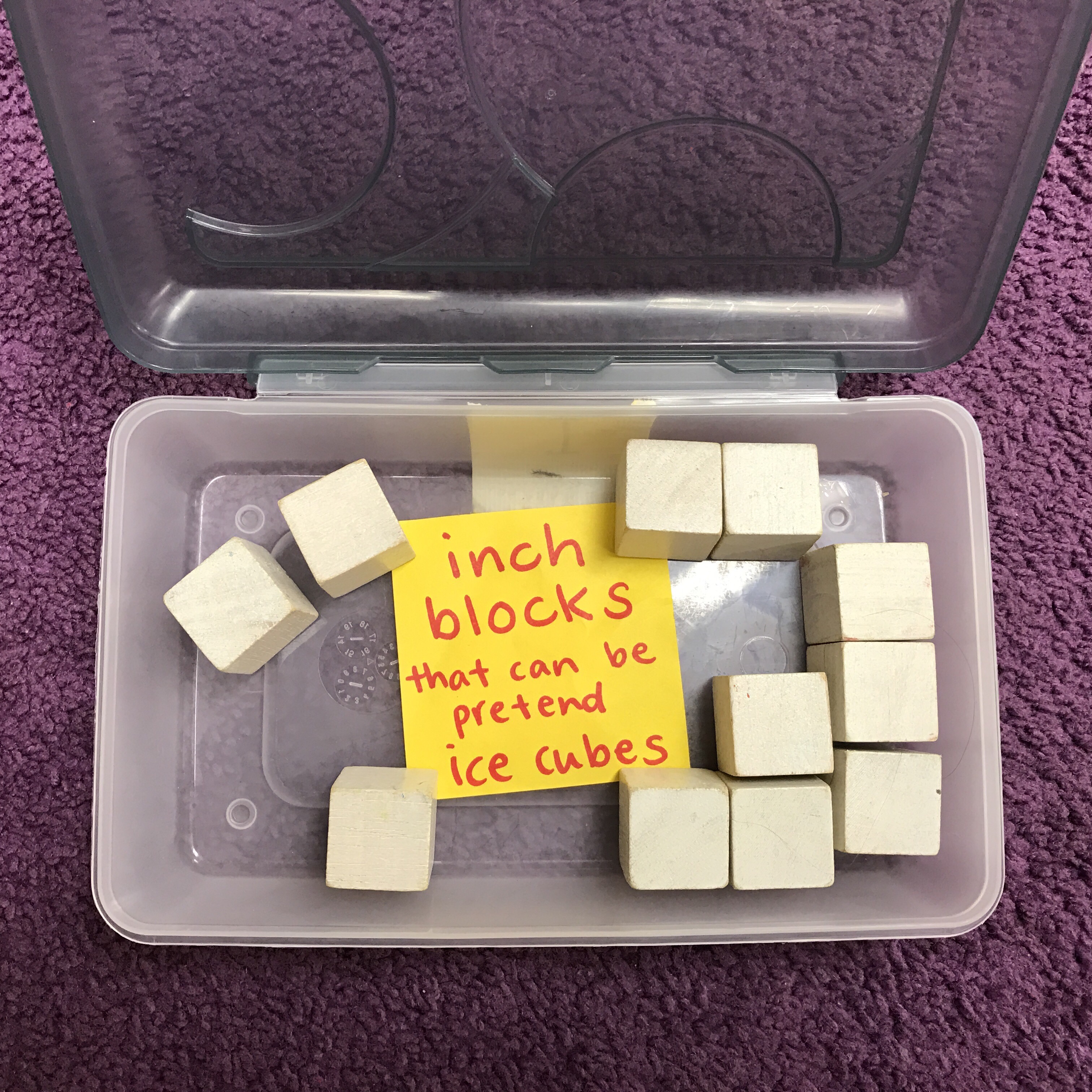 our alphabet box had white inch blocks and not pictured are the tongs we tried using to make an ice cube tower eleven inches tall!