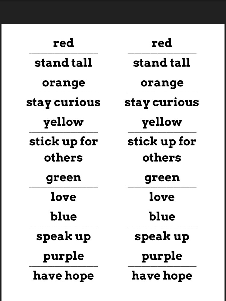 as classes we’ll be painting big pieces of paper red, orange, yellow, green, blue, purple, black, white and brown. those will dry for a day and then cut apart into shapes, glued on to another paper and used as backgrounds for these words: