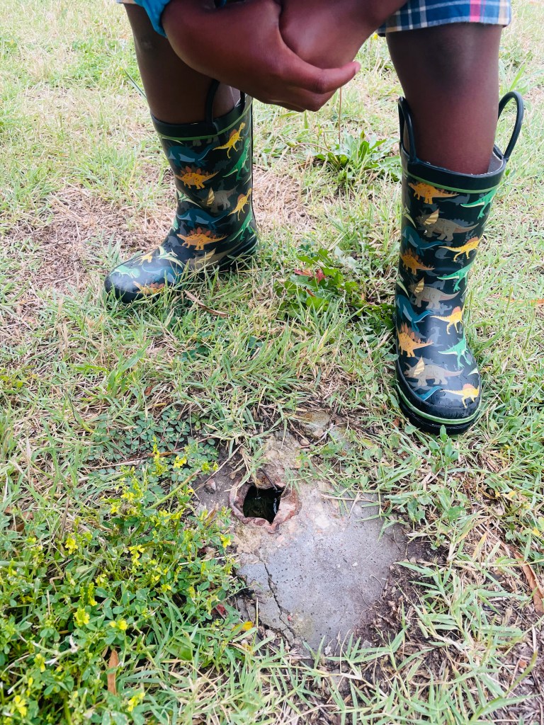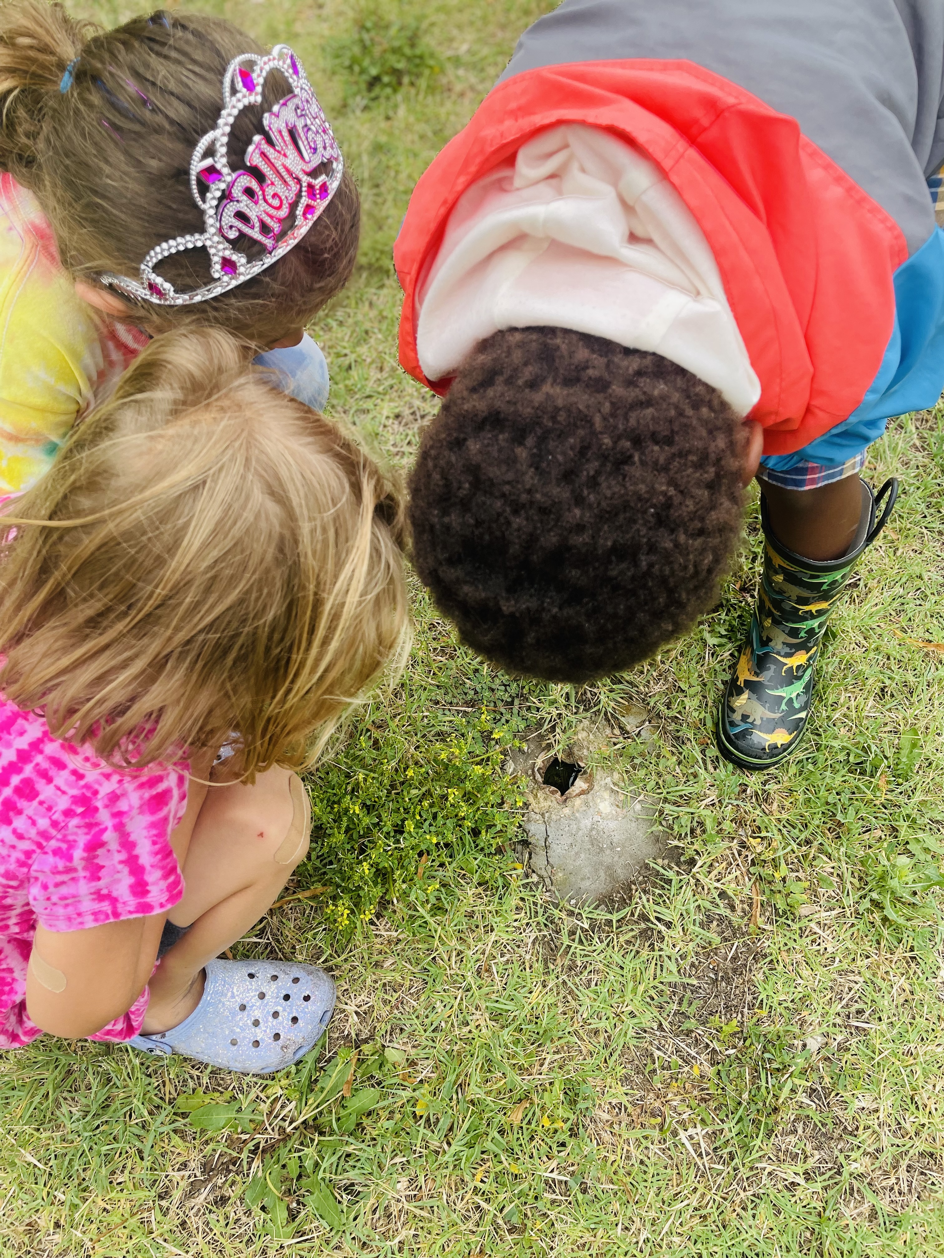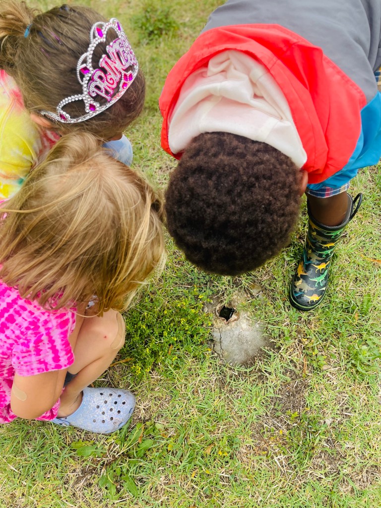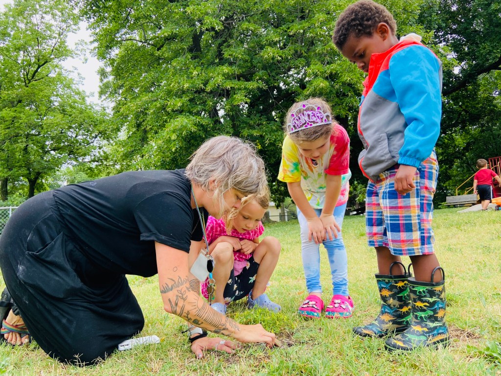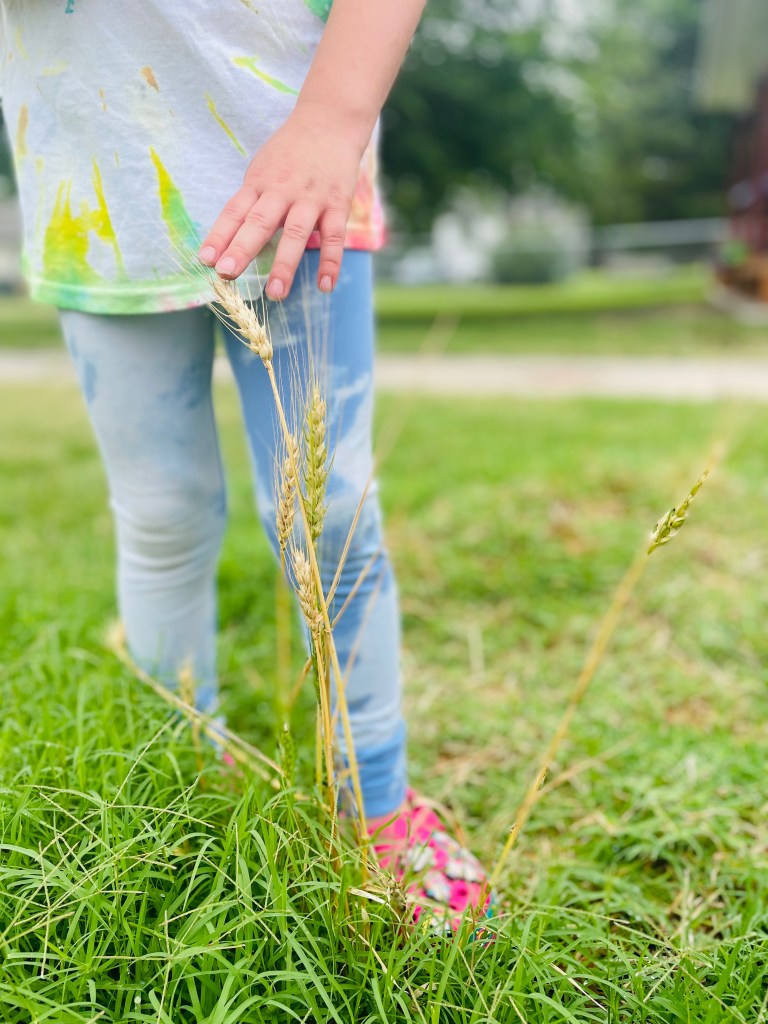 What watermelon song did we sing during our parade walk to the gate? Down by the Bay! (if you click the link you can see Raffi singing this song live with children). We had play time outside with watermelon, exploring the wheat growing in the hay bales, climbing on the muddy hill, exploring a hole and kicking a ball that looked like a watermelon! The neighborhood lunch program starts at 11:30, so we stuck together until our grownups arrived.