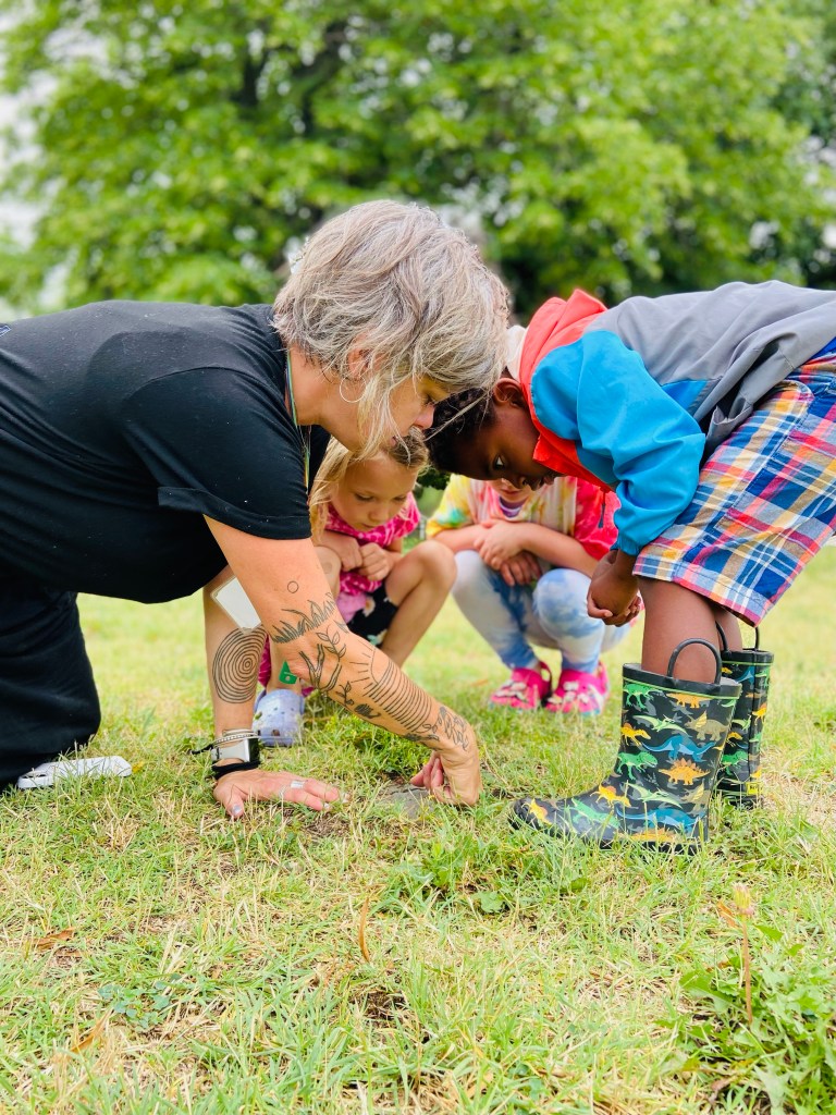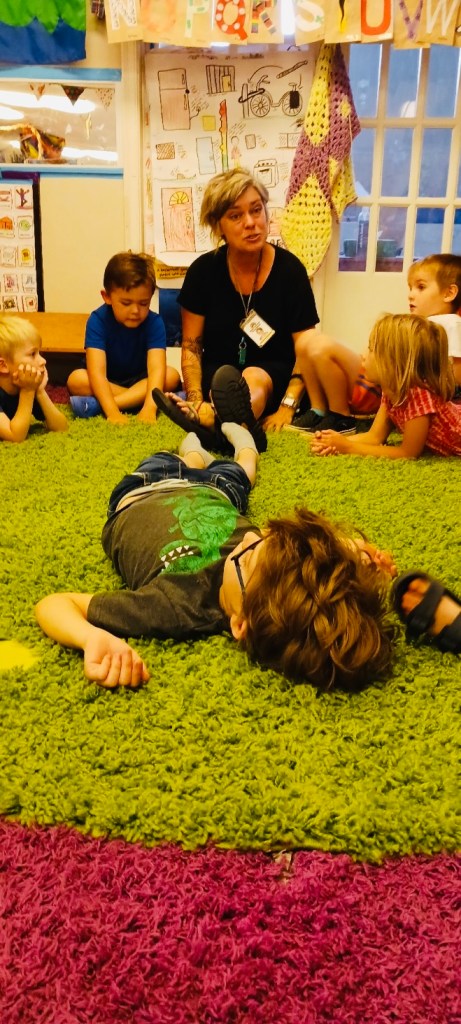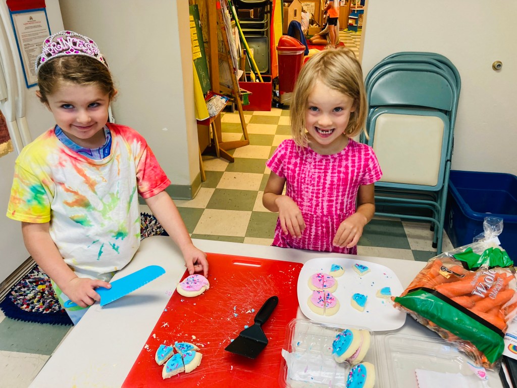 What did we eat and where did we eat today? After Circle Time, we washed our hands and ate special cookies inside for Owen’s birthday! After cutting open the watermelon outside, we ate as much of that as we wanted anywhere we wanted to. Mr Petr took the rinds home for Ginger the pig.