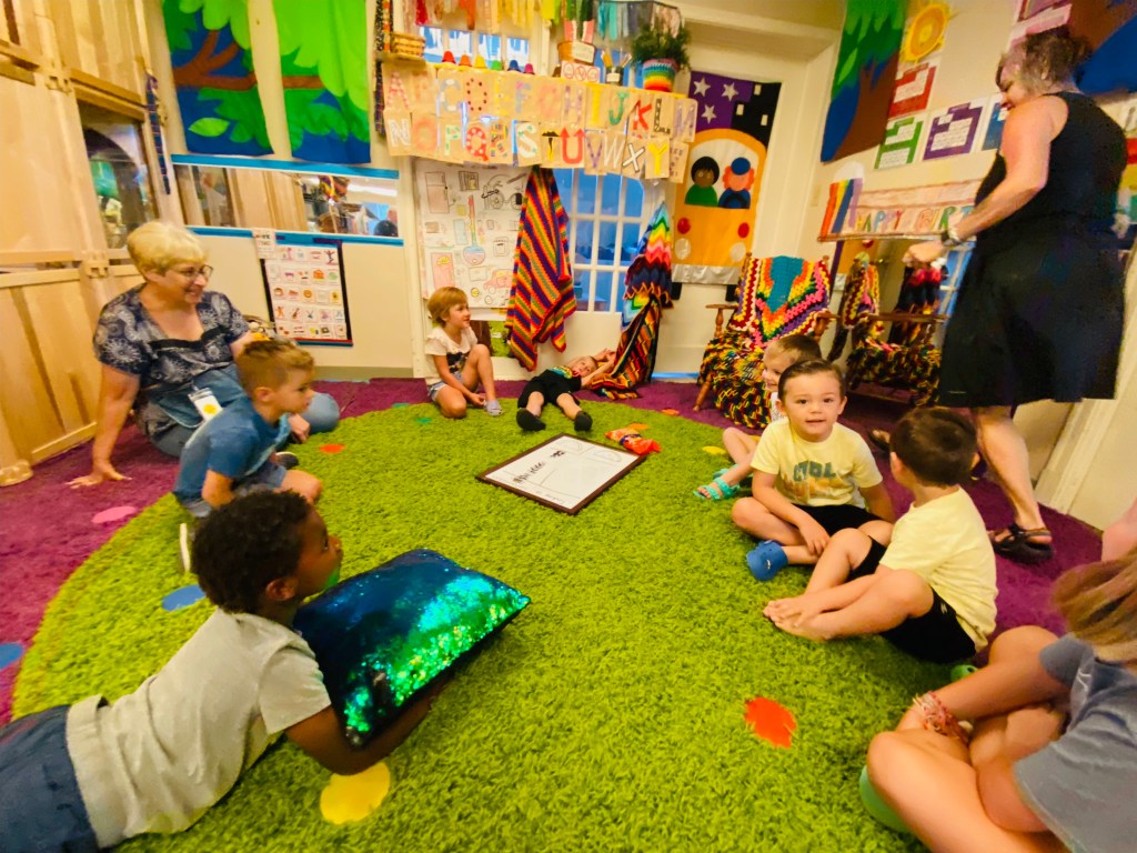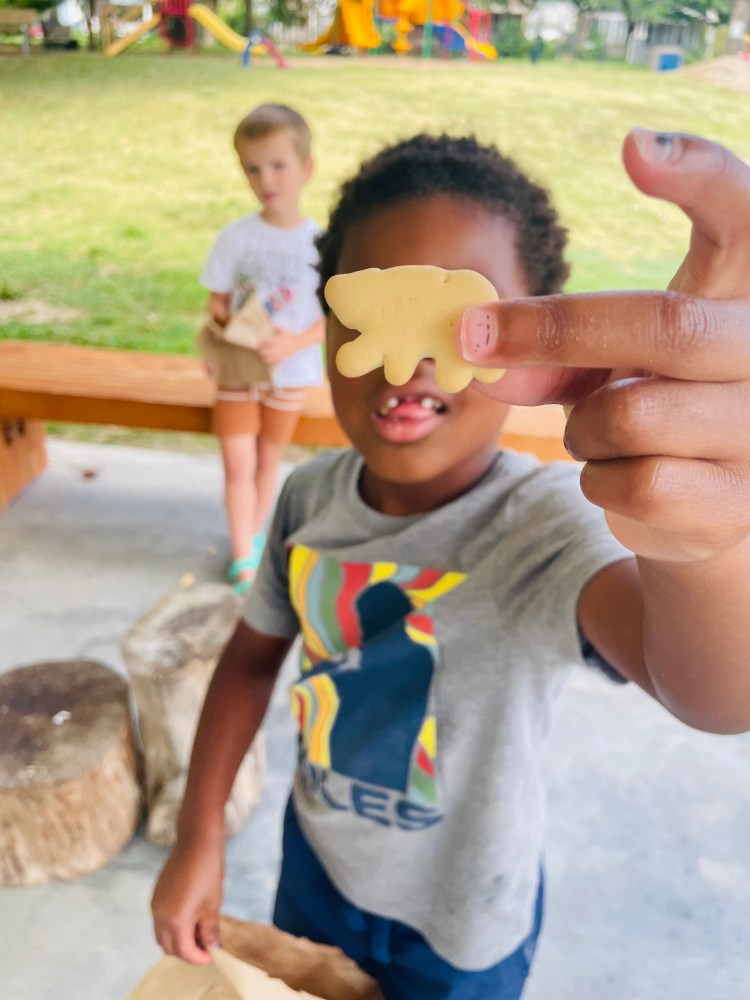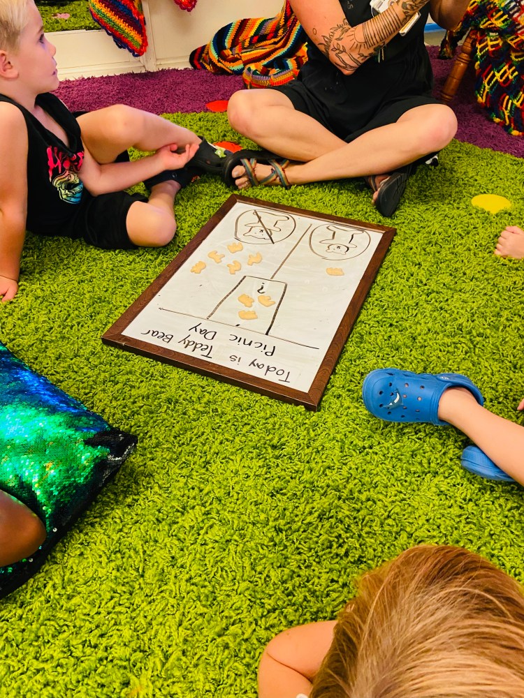 Where did Ms Kristin put some animal crackers during Circle Time? On the big dry erase board! We were trying to decide which animal cracker shape was supposed to be a bear. We used the consensus model which means we needed 100% agreement on BEAR or NOT A BEAR. Our plan was that if even one person thought it could be a bear, we kept it in the “QUESTION MARK” section.