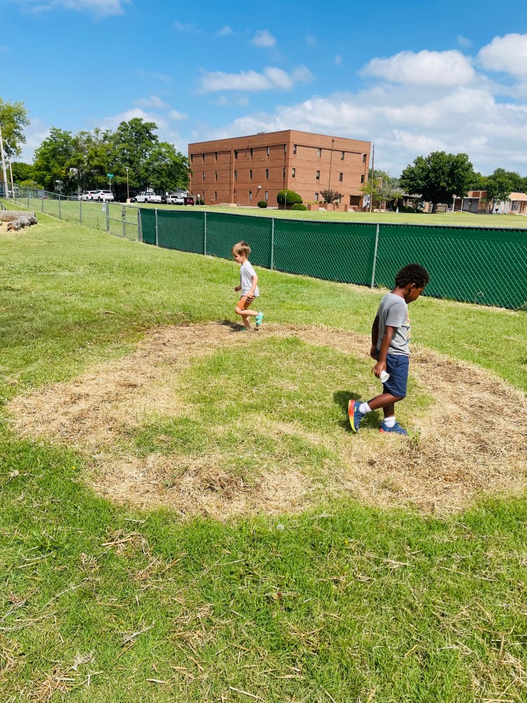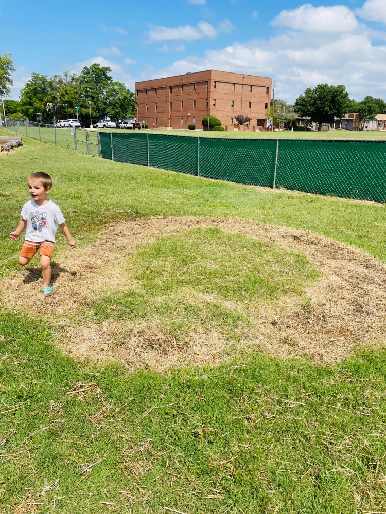 Ms Kristin knew the true story: Since the hay bales were almost all the way squished and getting loose, Grandpa Kelven put them all in his truck. It was a big job because they were falling apart! Then he took them home to put on his and Ms Brenda’s garden! We have the perfect circle to remind us of where they used to be. Thank you, Grandpa Kelven!