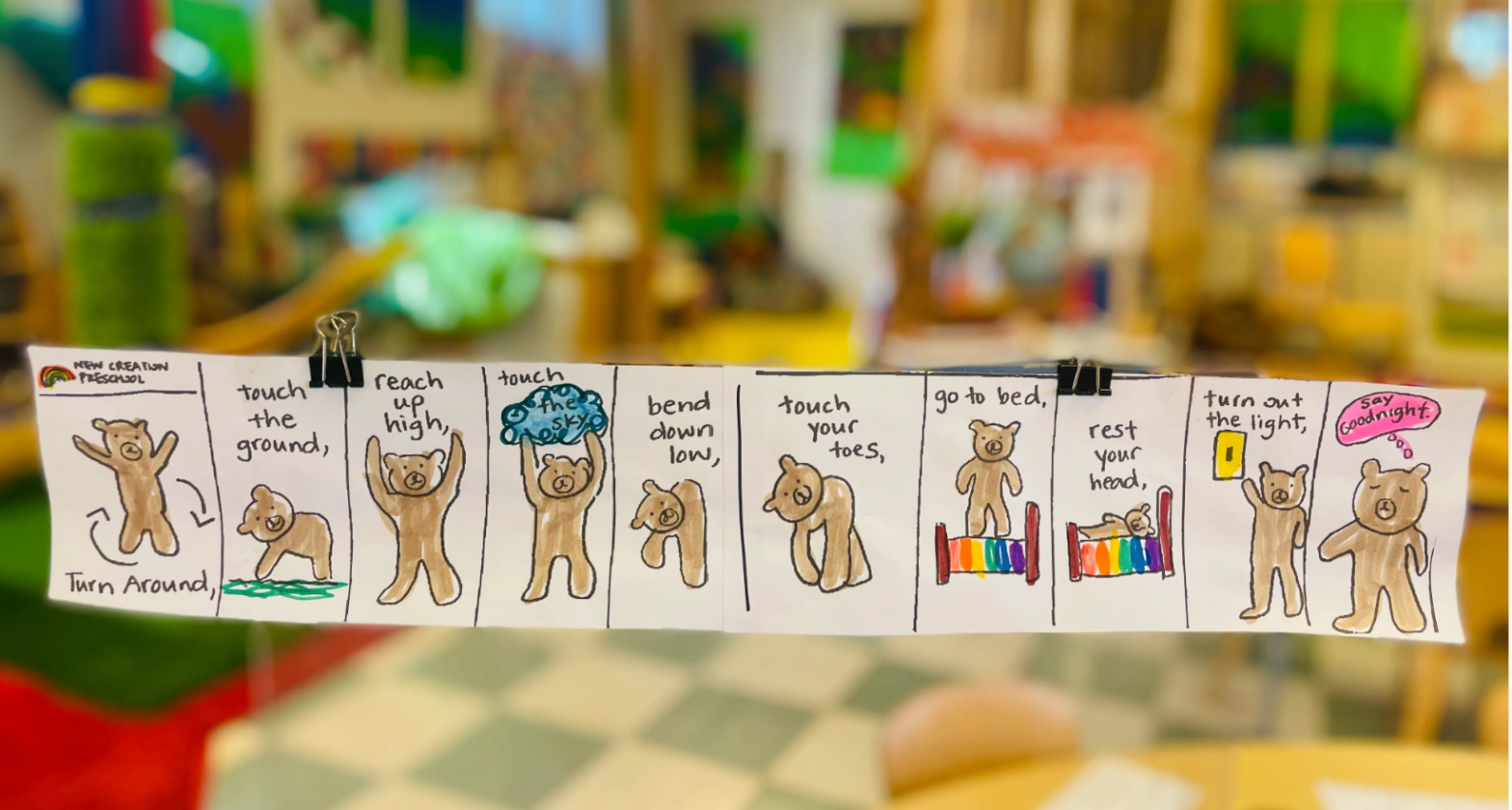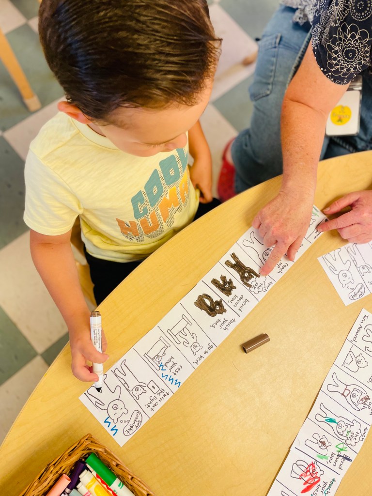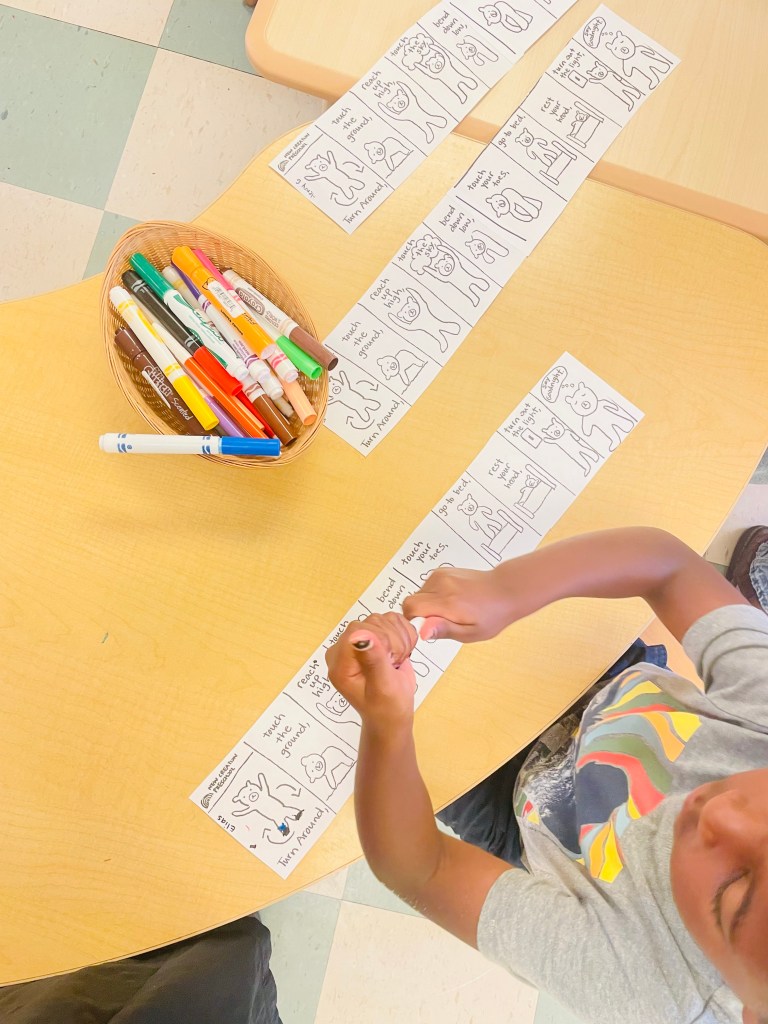 What did the bear do when they went to bed? Jumped on the bed! We talked about this and more while adding color to our Teddy Bear rhyme pictures. In a project like this*, we take it as opportunity to talk about colors and connections to their own lives…does your body jump? Do you have a bed? Have you ever used a light switch?