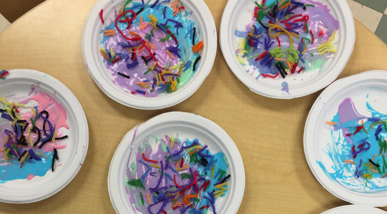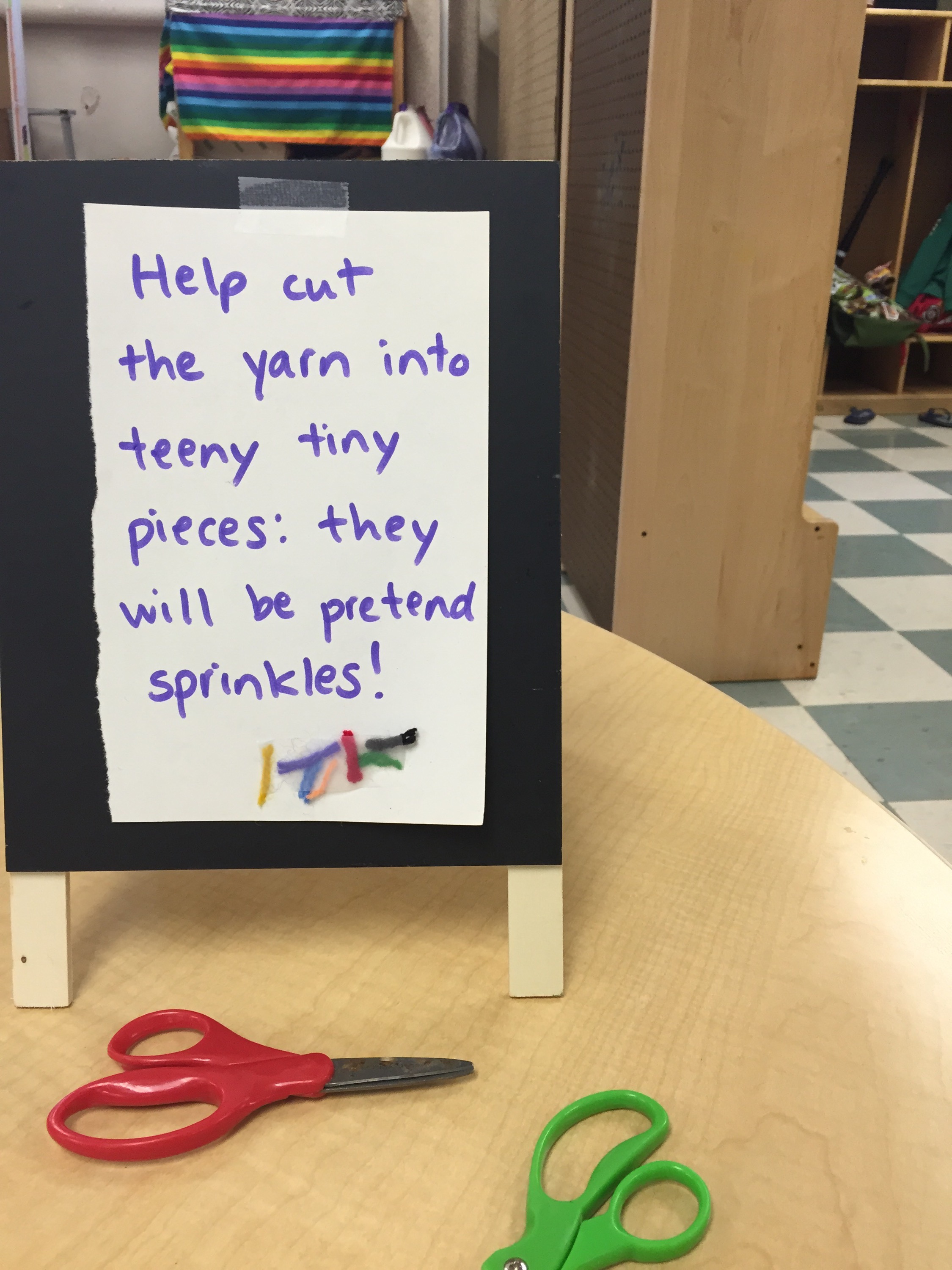 First we had work time inside: doing what we do during preschool, plus playing on a skateboard….that was new and had me think it might be a good thing to have more often! We also made cookies out of play dough, snipped yarn to be sprinkles, mixed glue and food coloring in pastry bags for our cookie project, all with a generous amount of giggling.