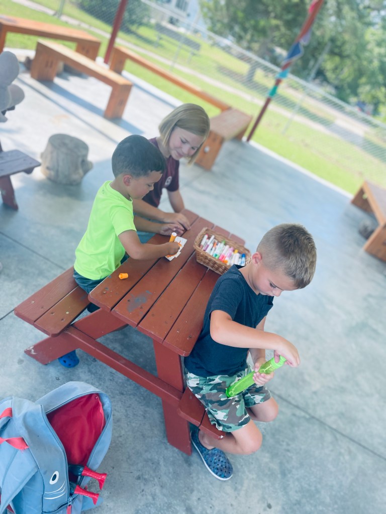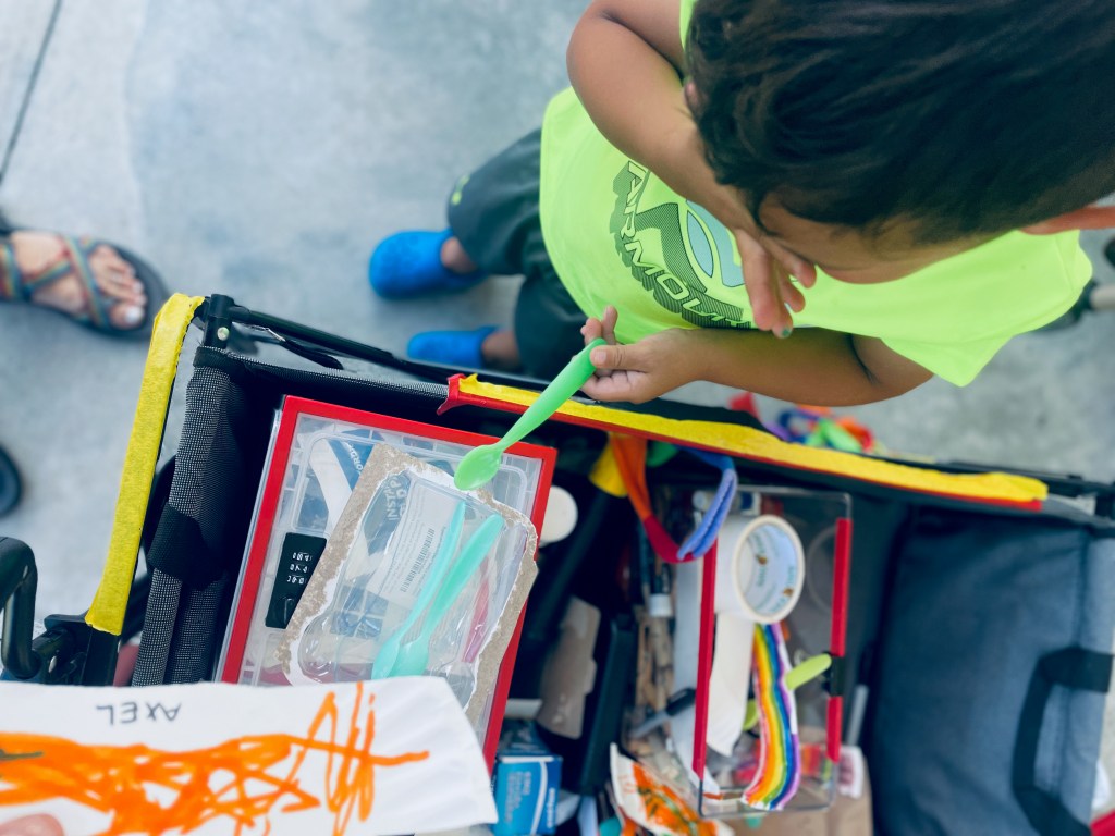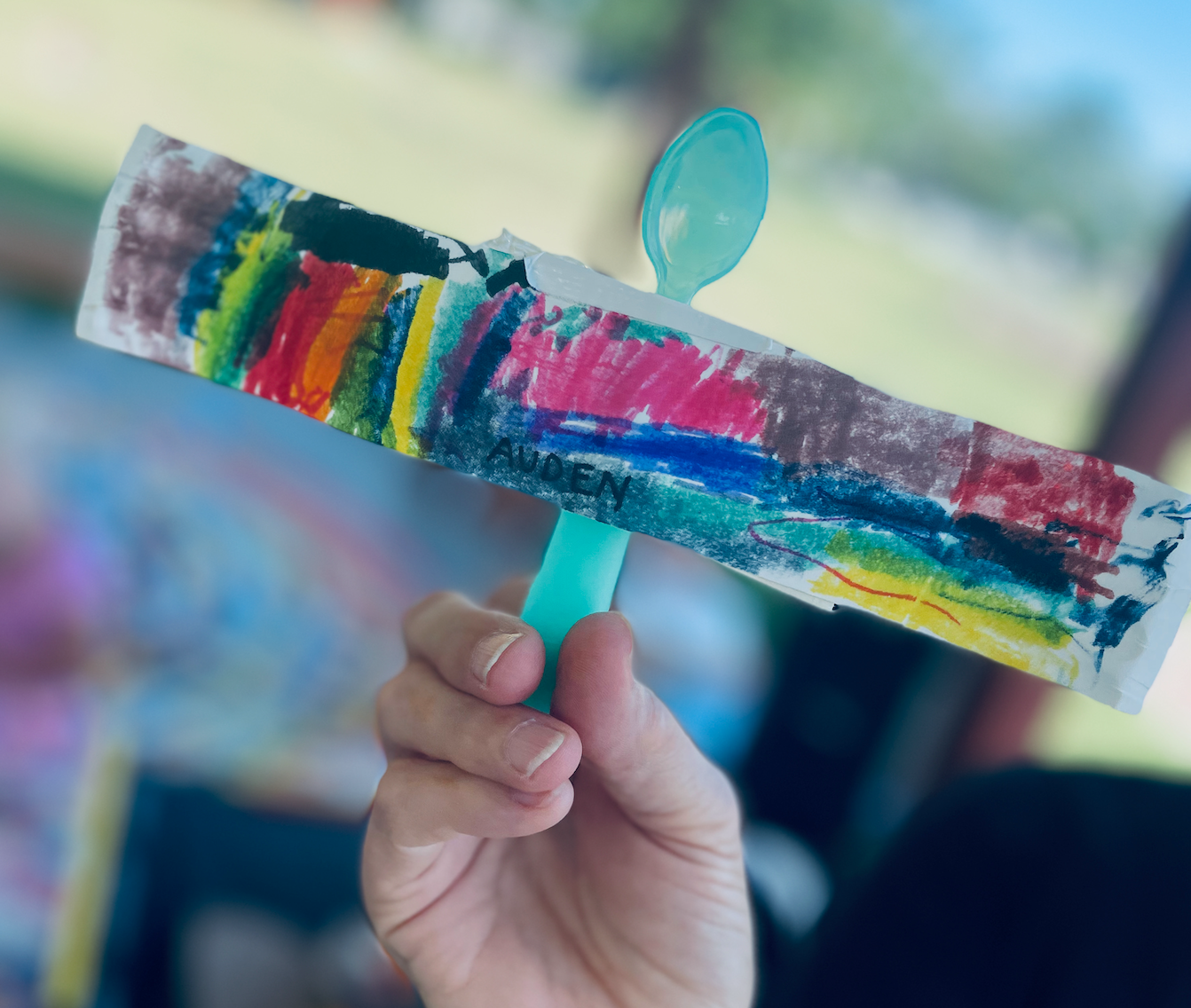 What was taped to the picnic tables when you got to preschool? Paper wings! Everyone could add any color to the paper with markers (including a few nacho cheese scented ones from this online preschool day). The next step was choosing a spoon and duct taping it on.