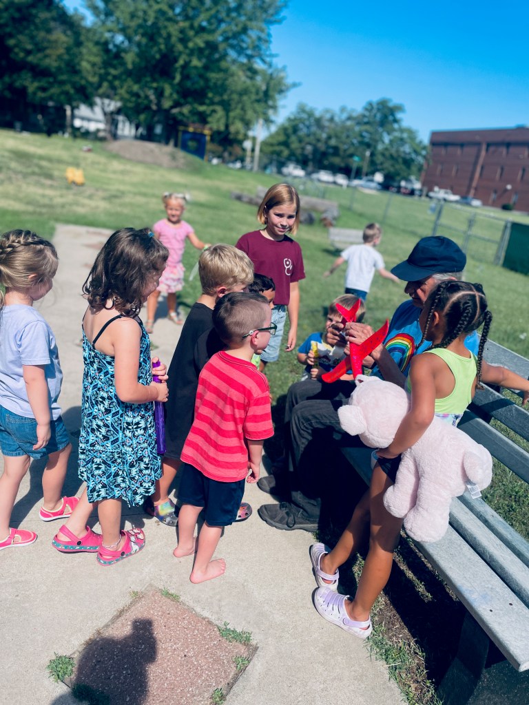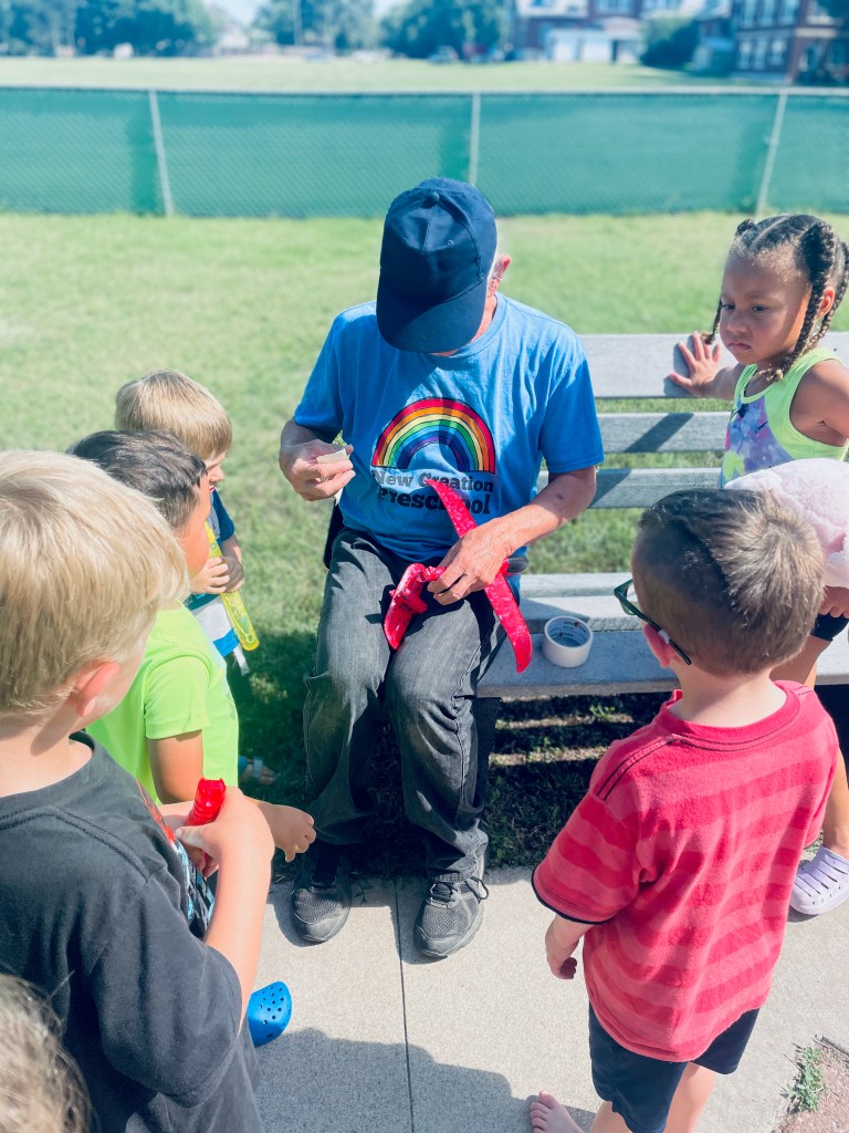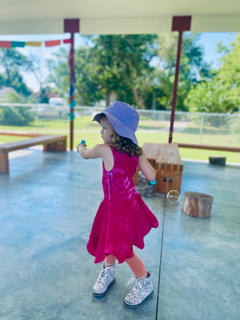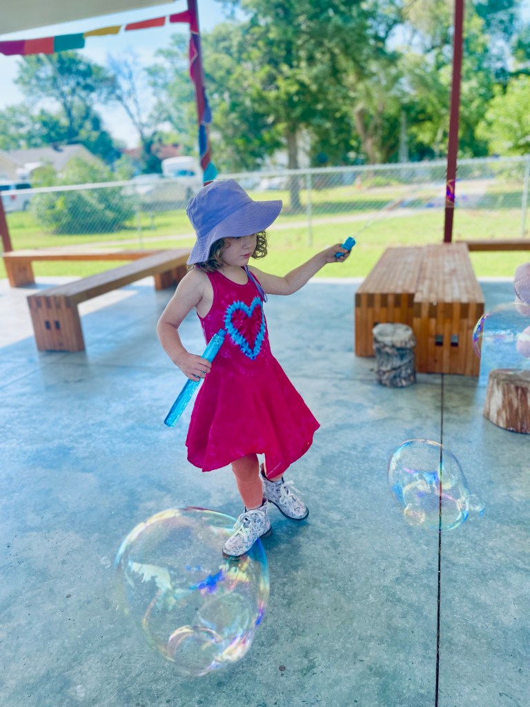 Who got to blow the bubbles today? Anyone who wanted to! Often the teachers are the bubble blowers and the children are the bubble chasers, but today children blew bubbles too. The airplane flew right through them many times!