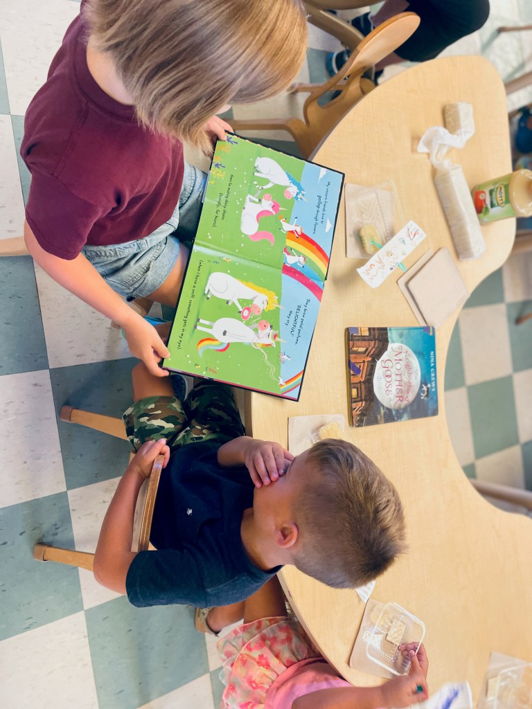 During Snack Time, our friend Ms Ruby (who used to be a preschooler!) read us books. When she got to the Neighborhood Mother Goose rhyme Pat-a-Cake, Ms Kristin got two dolls to demonstrate different ways people might help a baby do the actions. One of dolls has 2 arms and one of them has 1 arm. We also imagined a baby with no arms available for moving and they all did Pat-a-Cake in their own way! I bet your preschooler can demonstrate.