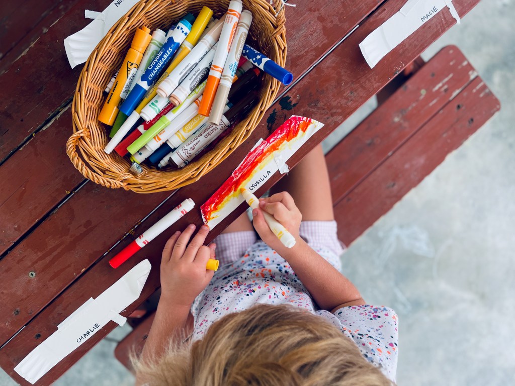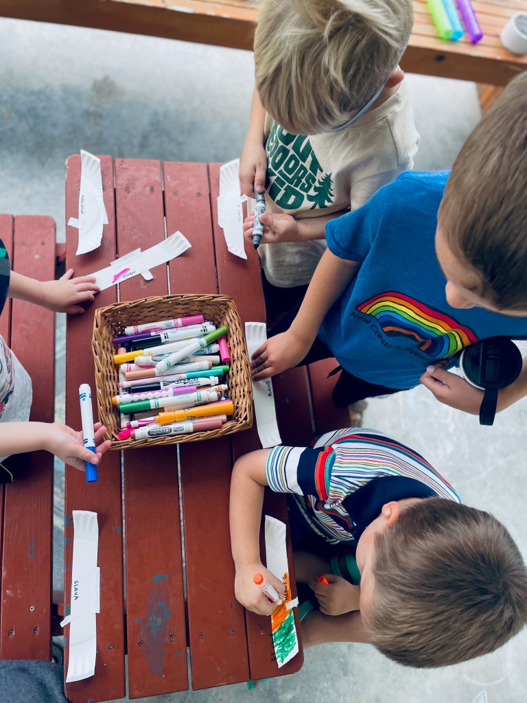 Sticking with the best flow we’ve come up with for our Play Days, we started the day outside. Once again the beautiful pavilion made the unexpected sprinkles no obstacle to getting our work done. The airplane wings were prepped on the tables for children to complete anytime before Circle Time.