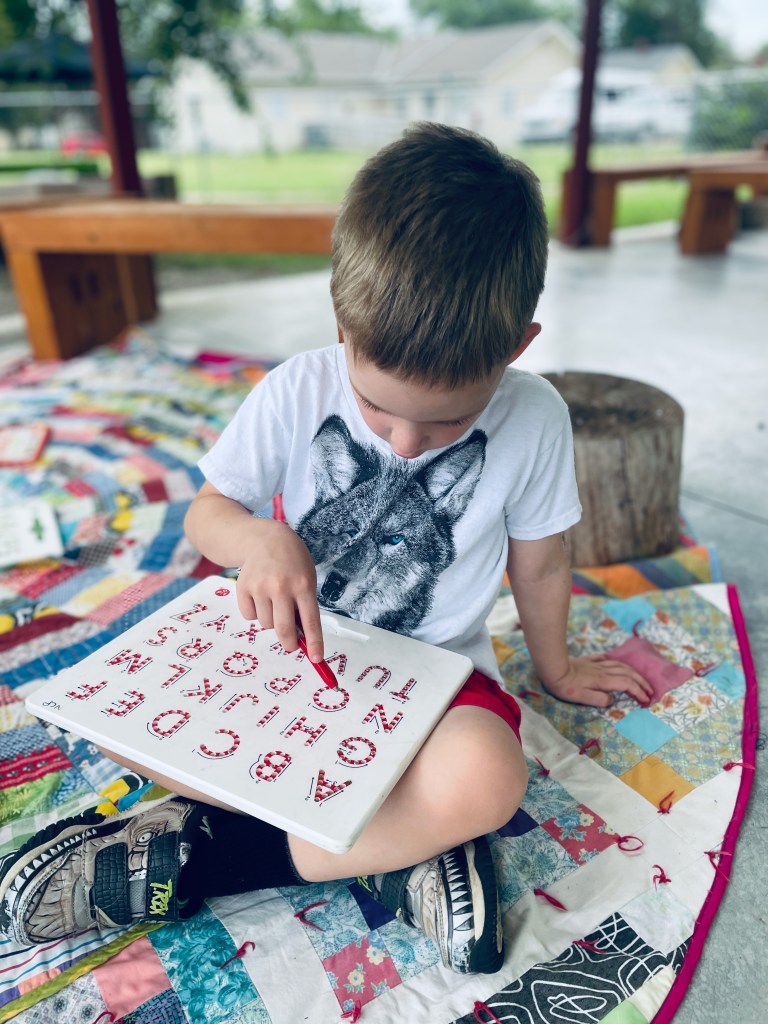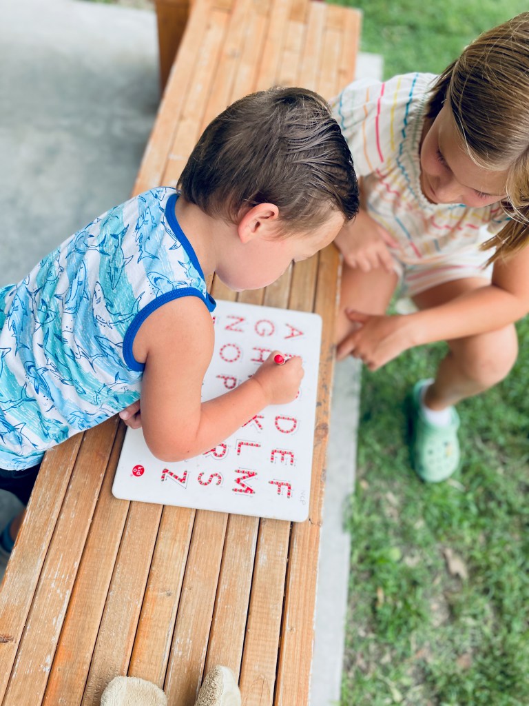 What do you call this toy? This is one of the items that we haven’t decided on a consistent name for. It was described very well by one friend: “the board with the little balls that come up to the stick thing when you put it close by.” Brilliant description! These are very popular and outdoor friendly items.