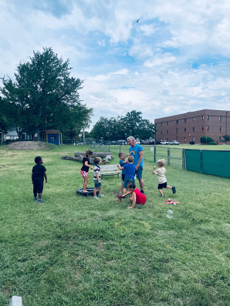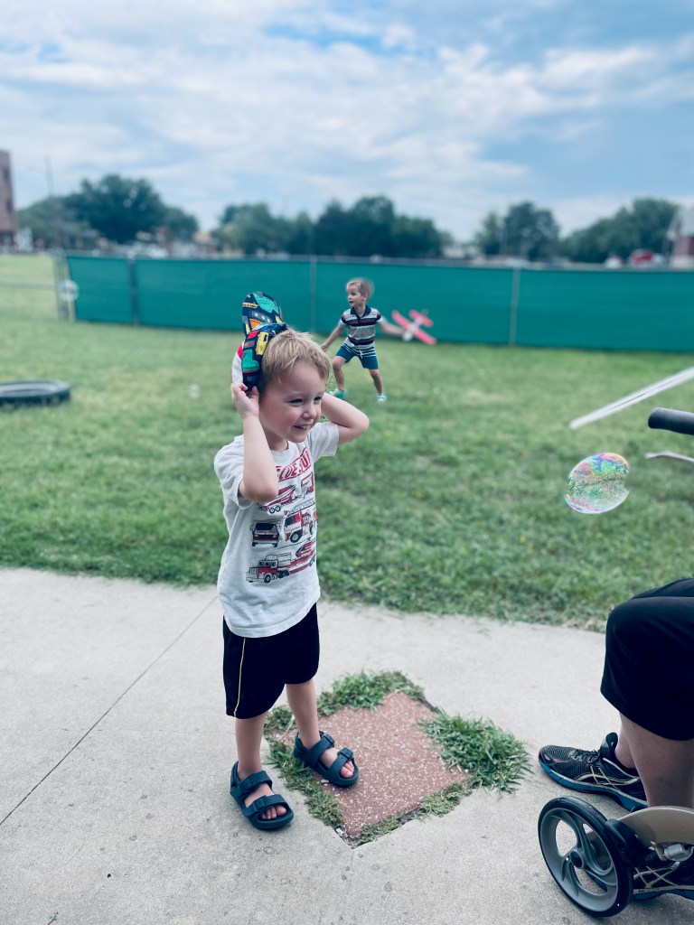 Did you play with bubbles? Were you the blower or the chaser or avoider? One friend had varying techniques for catching bubbles from Grandma Bonnie using his hat! Today’s group added a layer of play that involved standing in front of the bubble wand and trying to move side to side to avoid them. Clever friends!