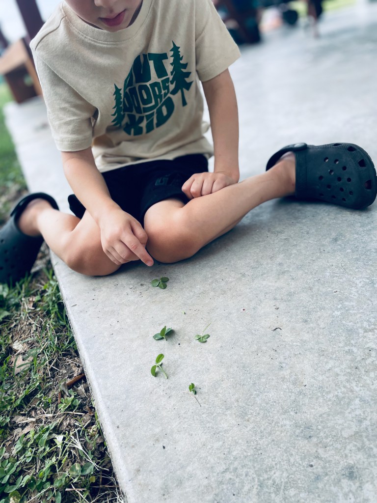 Have you ever found a 5 leaf clover? One friend shared that his mama is looking for a 5 leaf clover so a few friends sat down and got searching. We found a lot of 3 leaf clovers and turned some of them into 2 leaf clovers, but no 5 (or 4) leaf ones. Keep looking, friends!