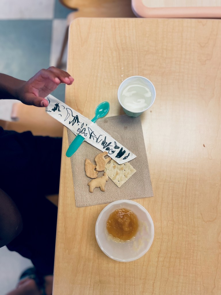 Why was the paper bag wet? After many guesses of what could be in the paper bag, it was disclosed that it was apple sauce! Ms Kristin demonstrated how one can eat applesauce with the airplane spoons right before we went inside to have snack.