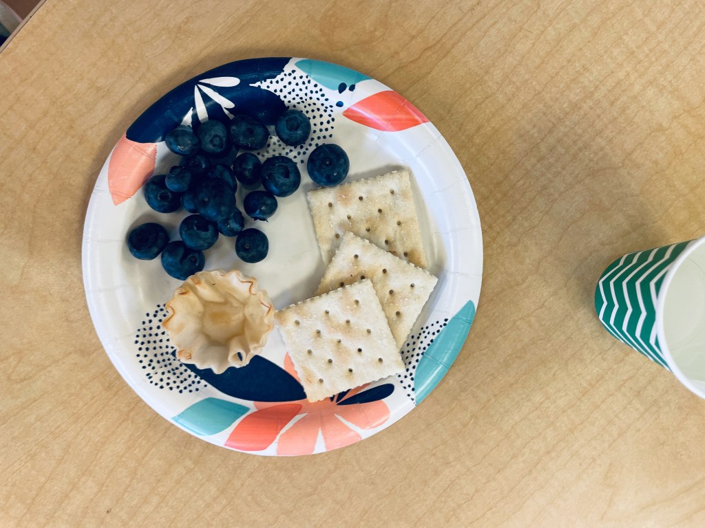 What was on your little plate at snack time? Blueberries, a mini puff pastry crust and crackers. Ms Eliza walked around with whipped cream for anyone who wanted some on their pie or on their plate. Some people had blueberries under the whipped cream and on top of the whipped cream! Then we took the whipped cream and crackers outside for anyone who wanted more.