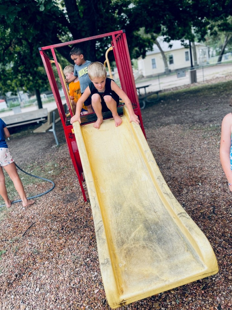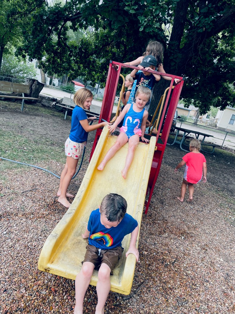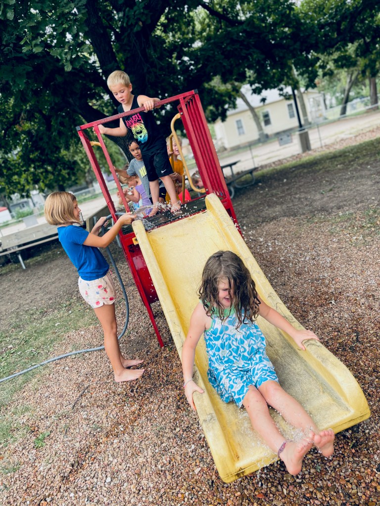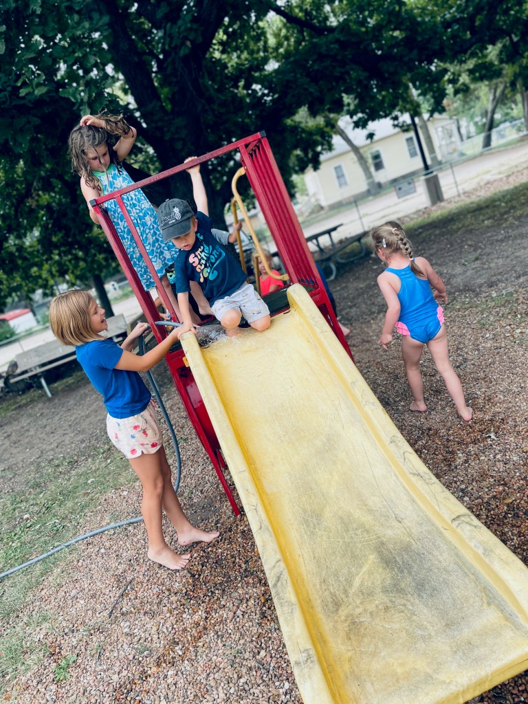 Where did Ms Kristin put the hose for the first time ever? On the slide! First we put the hose on the little plastic slide and then decided to put it on the slide at the top of the hill. It was very satisfying! We still had other slides that weren’t water slides if people wanted a dry experience.