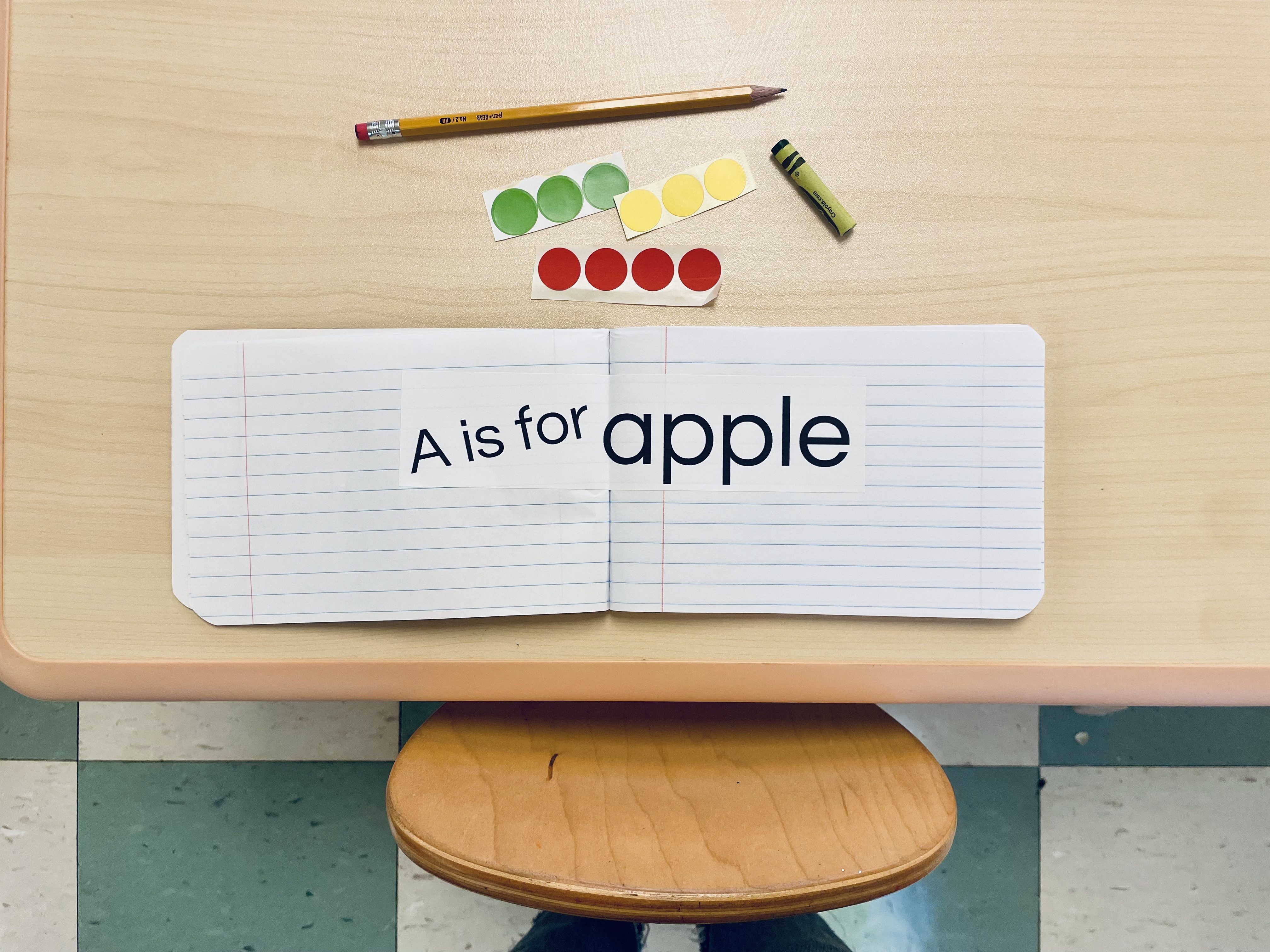 Everyone had red dot stickers, green dot stickers, yellow dot stickers, a pencil and a short green crayon.