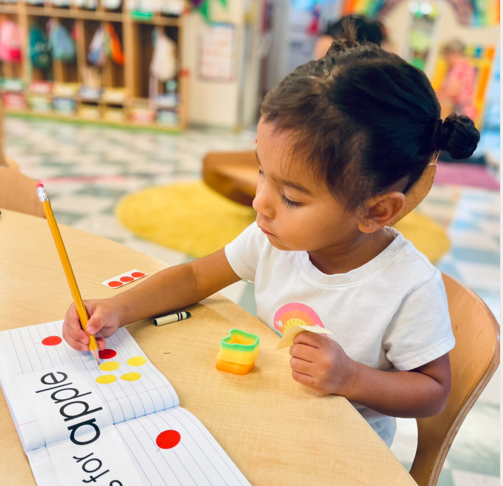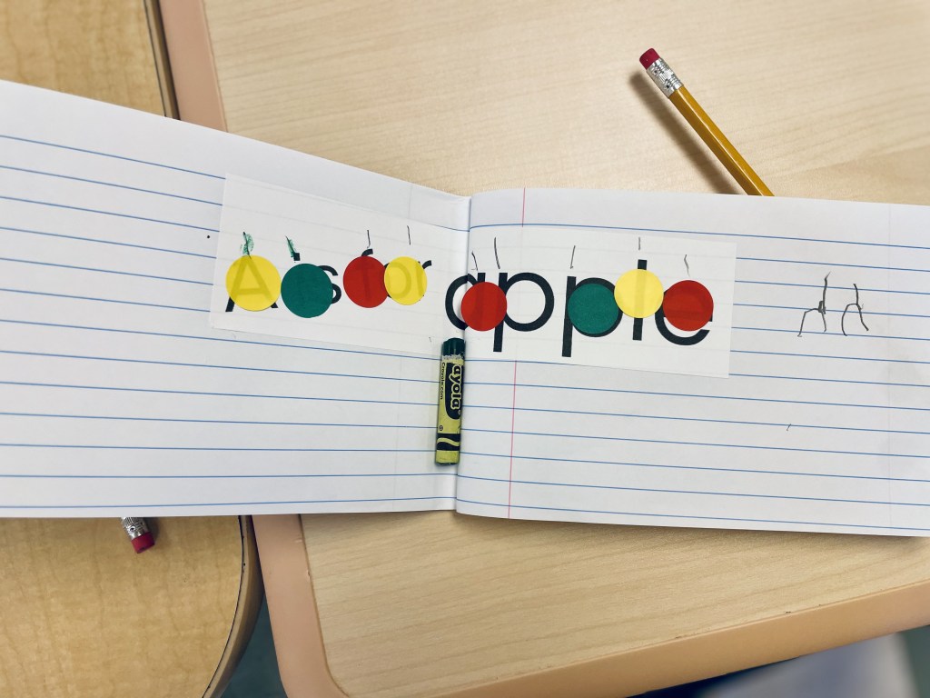 The stickers were pretend apples and the pencil/crayon were options for writing and drawing. Some friends made stems, some made leaves, some did scribble work, some did writing. The pencil gives them an opportunity to find a grasp that allows enough pressure to make a mark. The short crayons will naturally encourage a tripod grasp since it is harder to hold a short crayon with a fist. We do no redirection in the way they use these tools, just an opportunity to explore and use them.