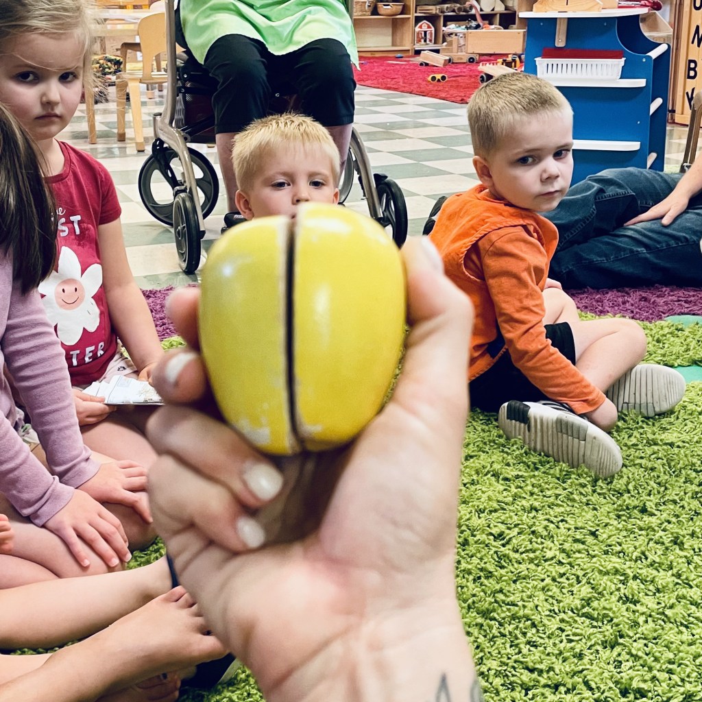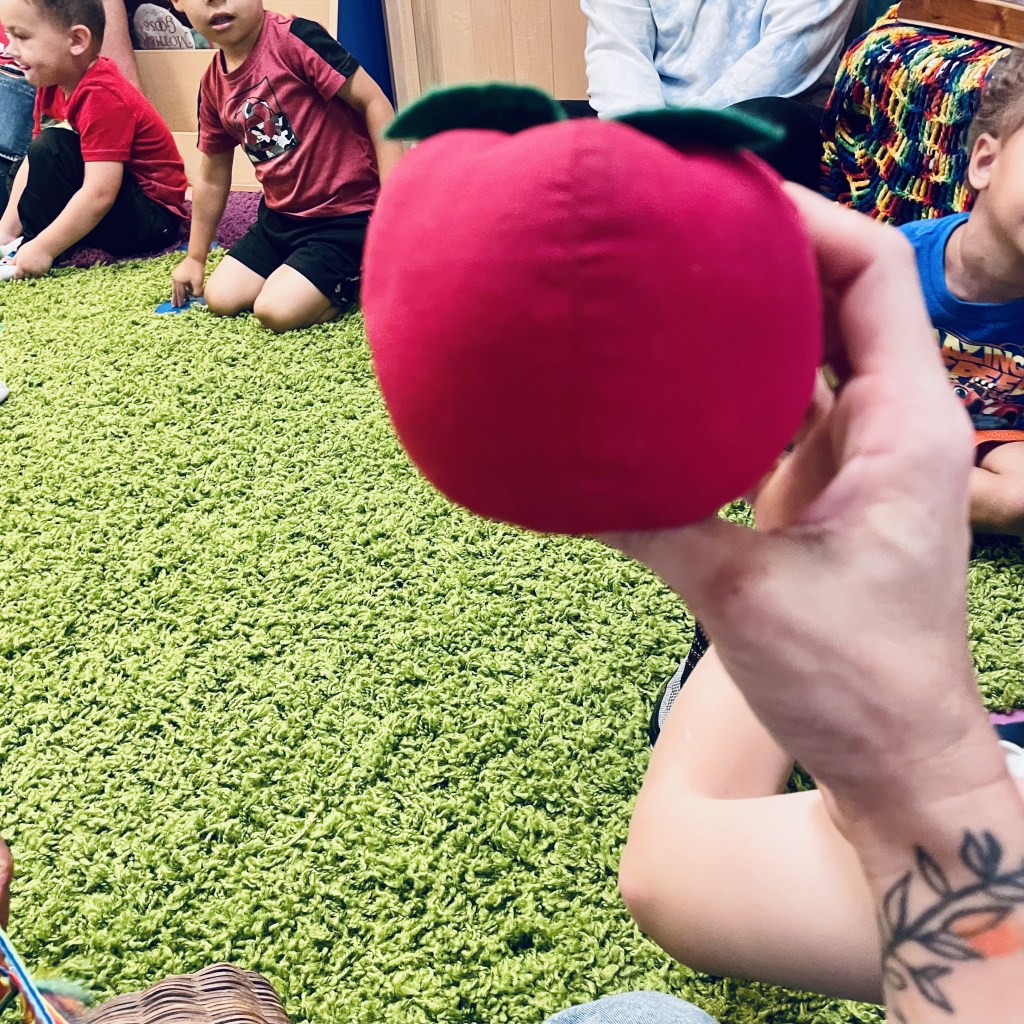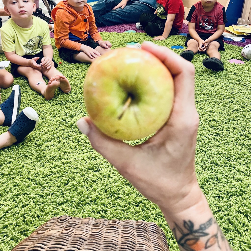 We played the same apple game as we did yesterday with many of the same clever replies. But then when looking at the real apple, one 4 year old found lines on the real apple! Thus, our “lines on an apple means it is not real” was no longer true! What a fun discovery.