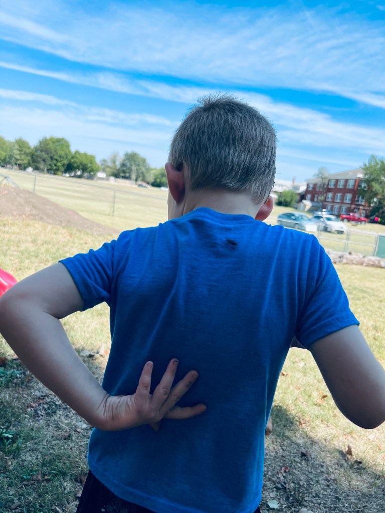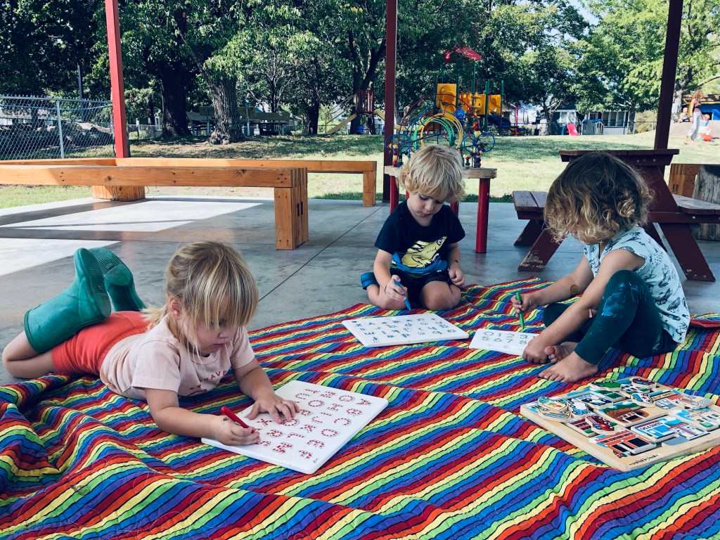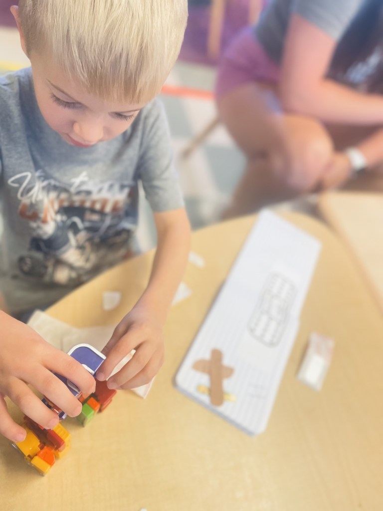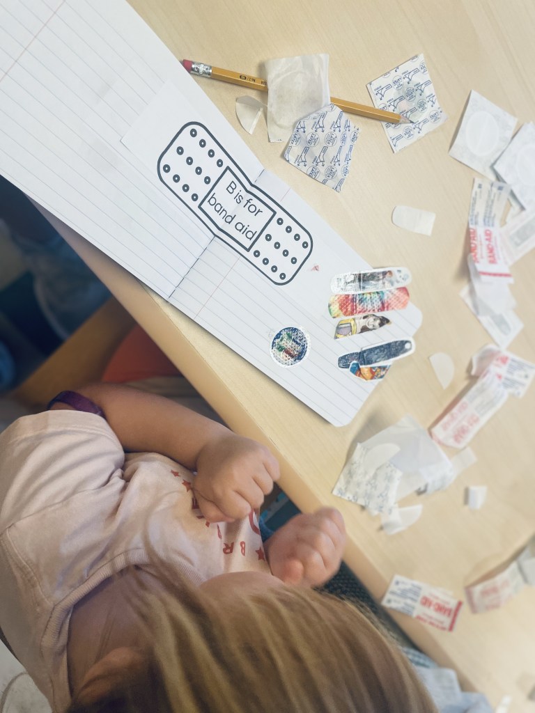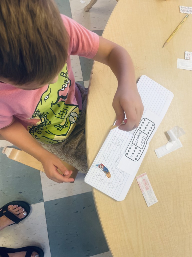 We spent time at Circle Time sharing what we know about injuries: who, what, where, when, why and how. Then I rang the red bell (in honor of blood) as I reviewed the injuries and everyone said, “Owwwwww!” These kids are full of injury knowledge! Then in a child led addition to my plan, they added band aids to the injury sites.