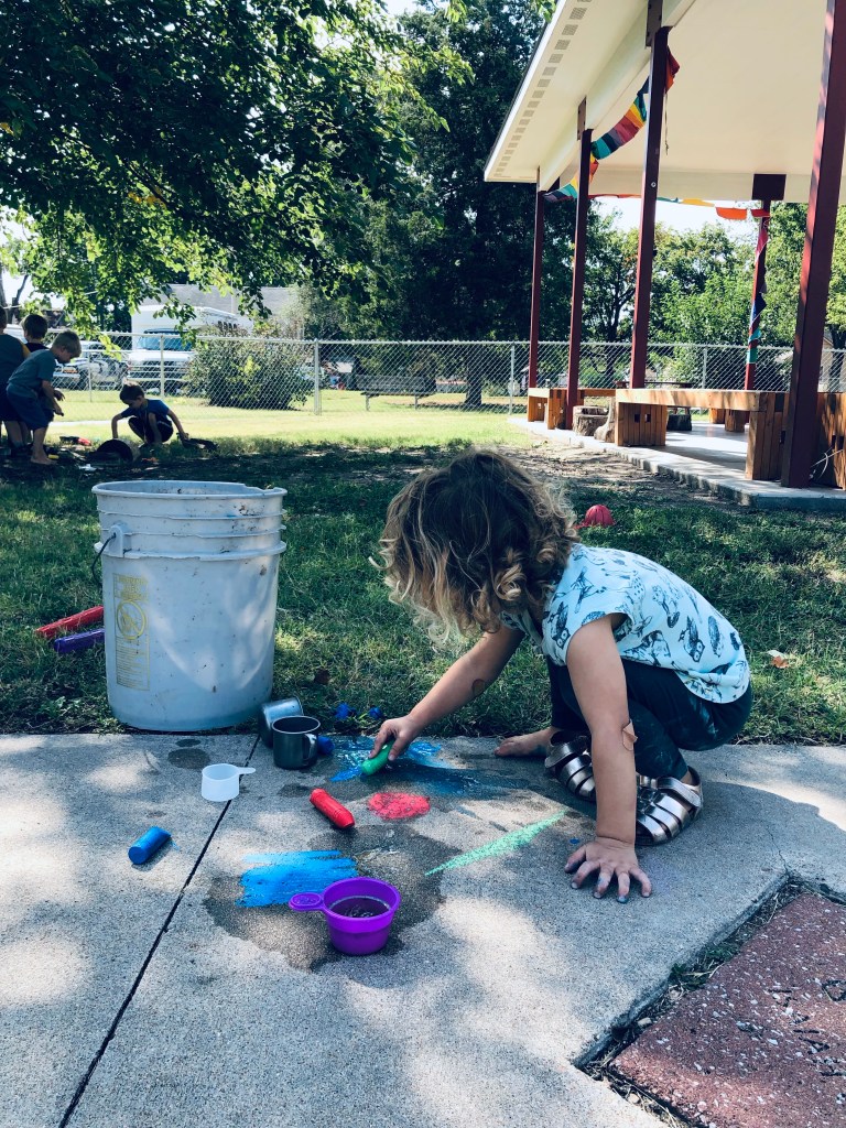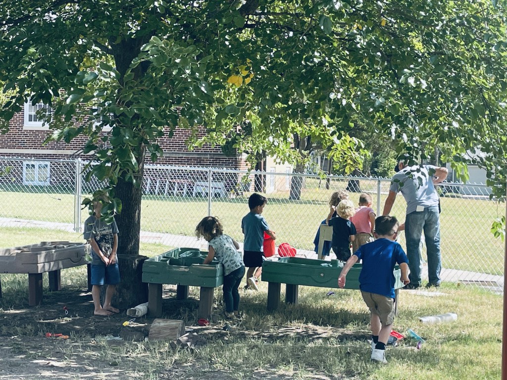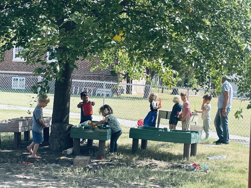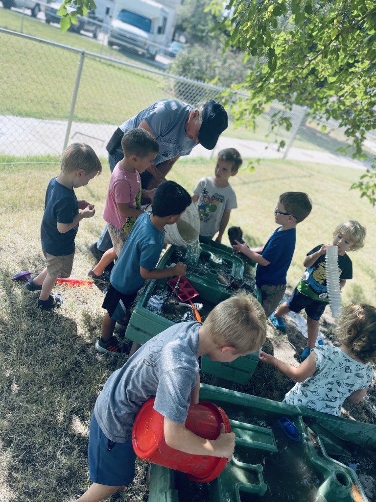 There is no hose available for creek filling, so it takes a lot of team work and patience to get it flowing. There is one faucet and 4 buckets which offers a great opportunity for a class of 13 to problem solve.