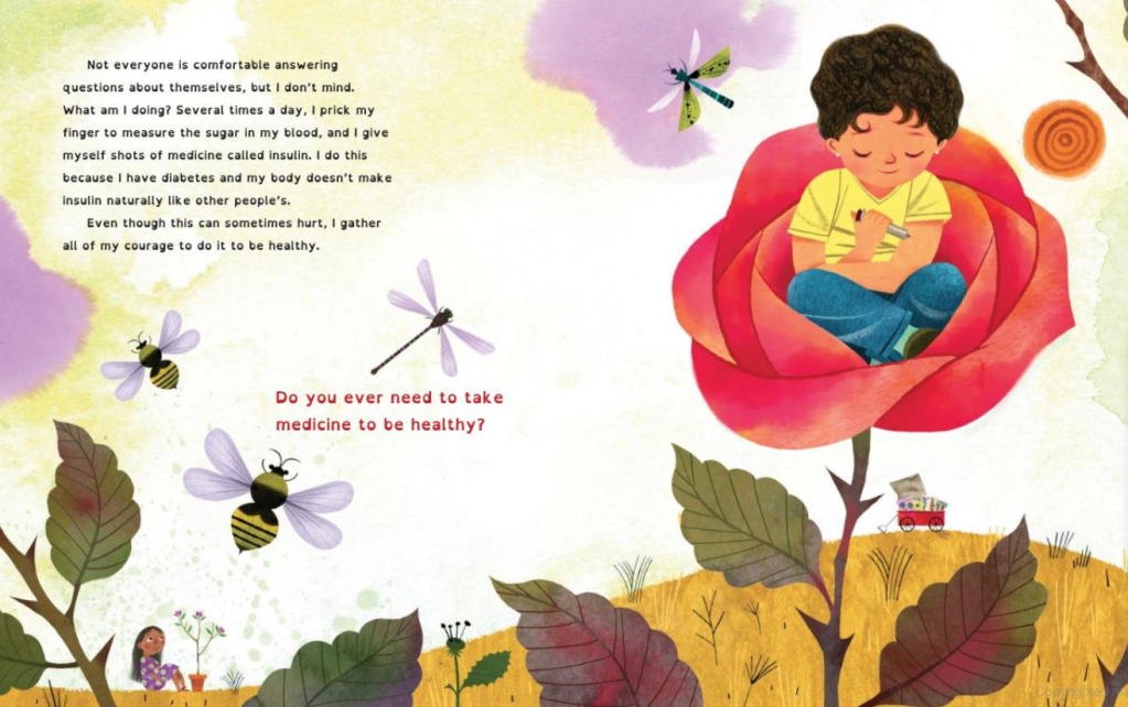 The grown up in our book has diabetes so gives herself injections of medicine. We also looked at the page of the friend with a nut allergy and talked about epi-pens which give medicine as an injection in the leg.
