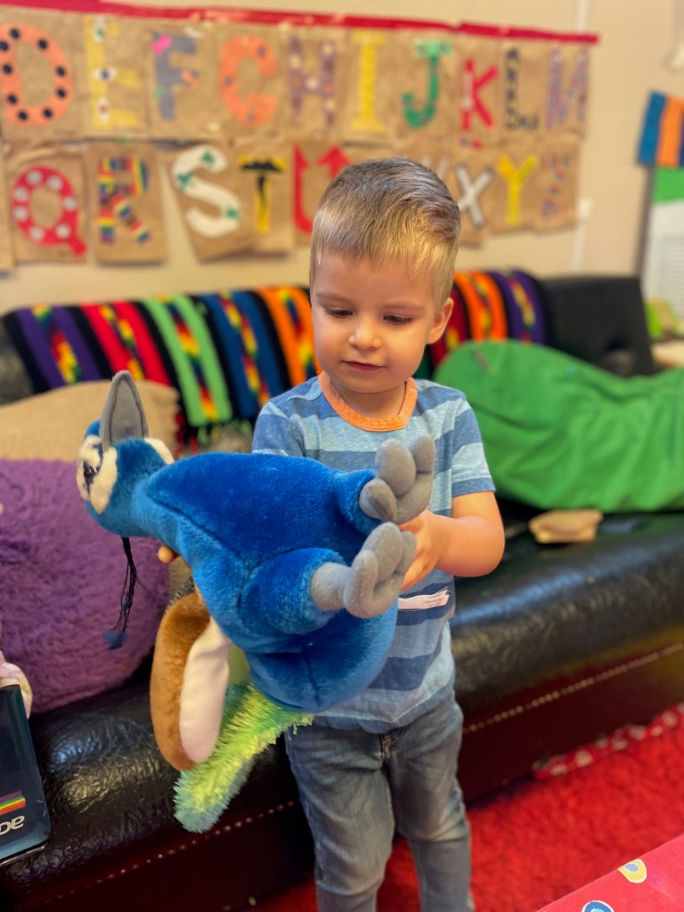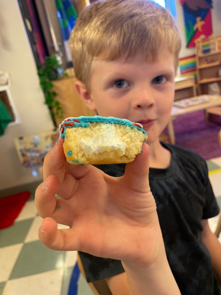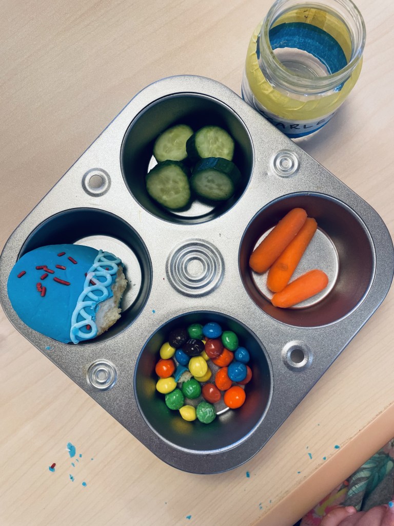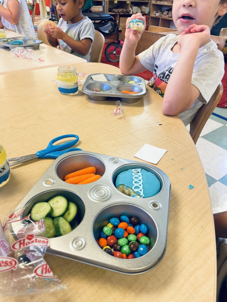 After Golden Letter friend Carter led us for hand washing, we found carrots, cucumbers, cupcakes, cookie crunch chocolates including safe versions for one friend in our trays! Thank you, Theodore!