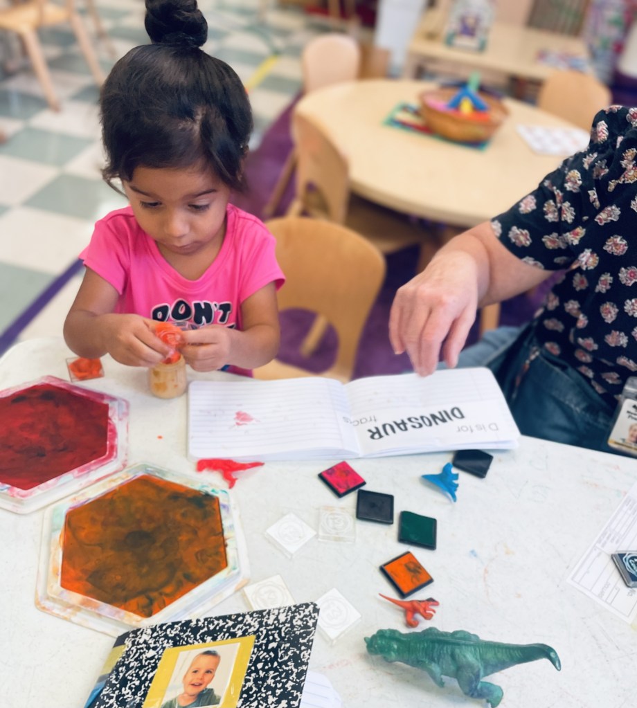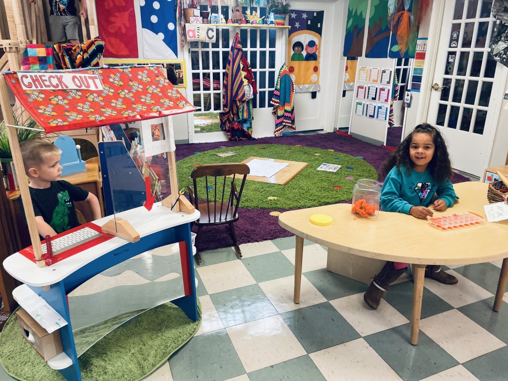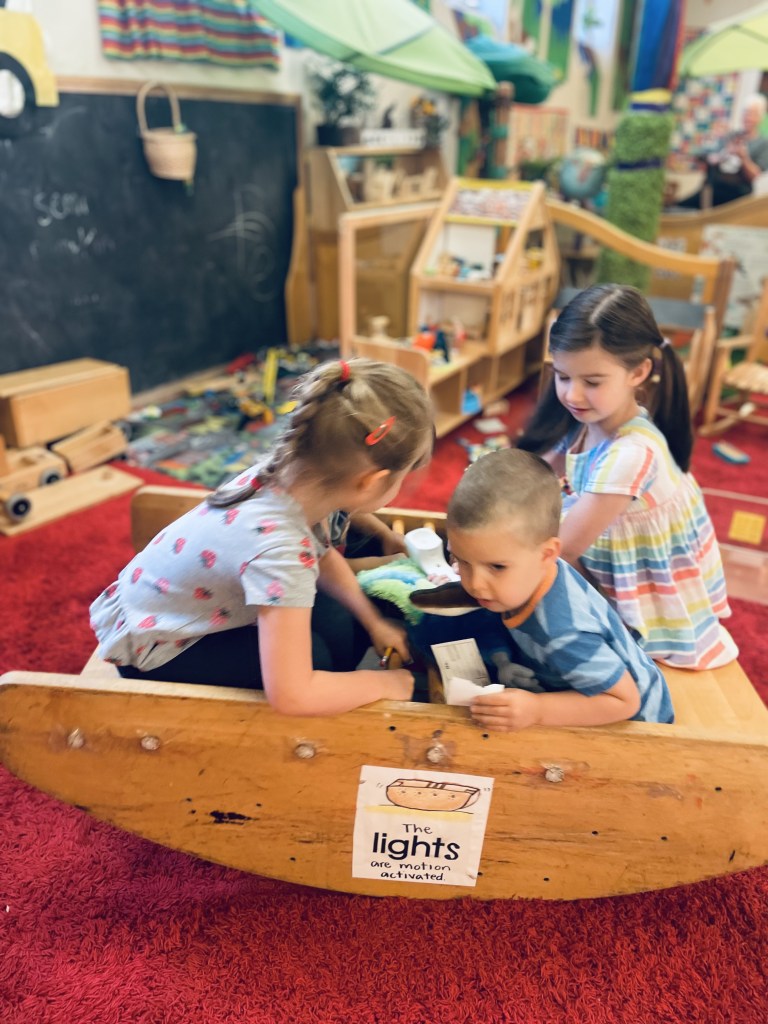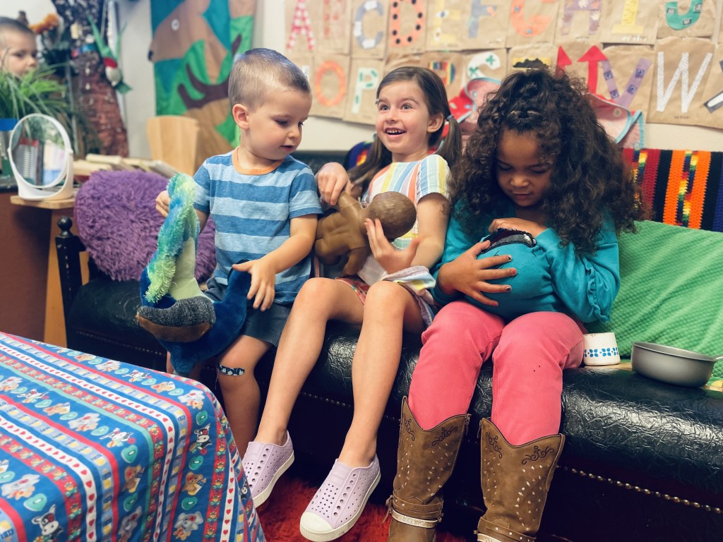 Options: go in the loft, use pretend computers and phones, cook pretend food, dress and undress baby dolls, pretend to be a parent, sit on the couch, have a restaurant, read books, etc.
