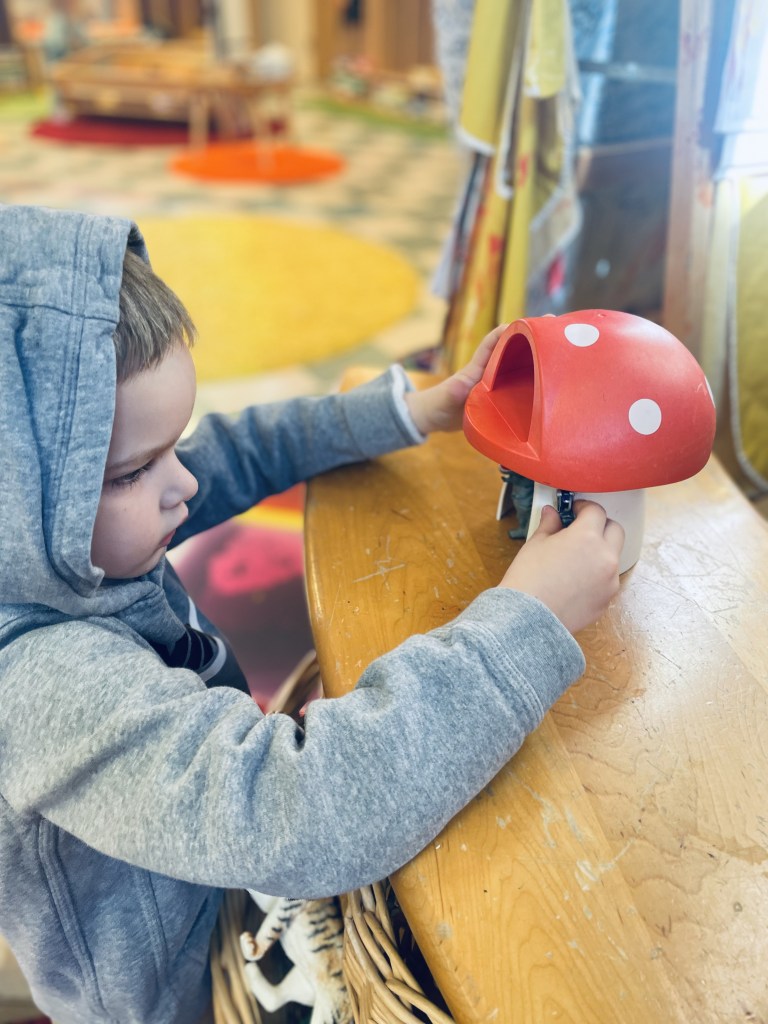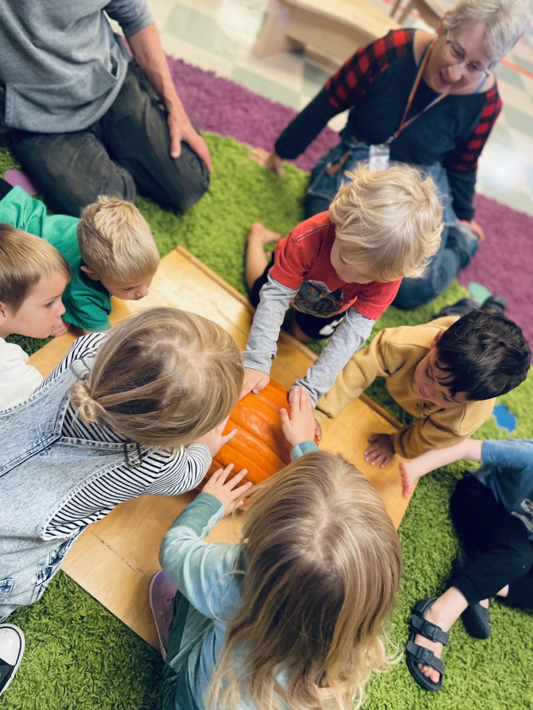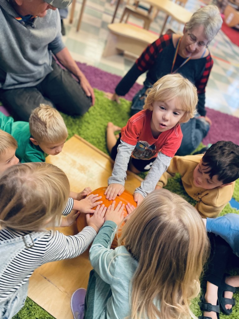 We found the spot of the pumpkin where it had been laying in the field, the spot where the flower once was and the stem where it had been connected to the vine. We talked about the inside of the pumpkin and made a plan for next week when we cut the lid off.