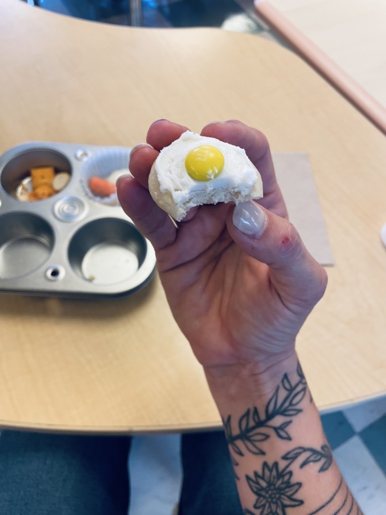 But the joke is…they were cookies with frosting and a yellow m&m for the yolk! We also had carrots, crackers and snap peas. There was careful work in extricating the peas from the pod. A couple friends took them home in hopes of planting them…see the video!