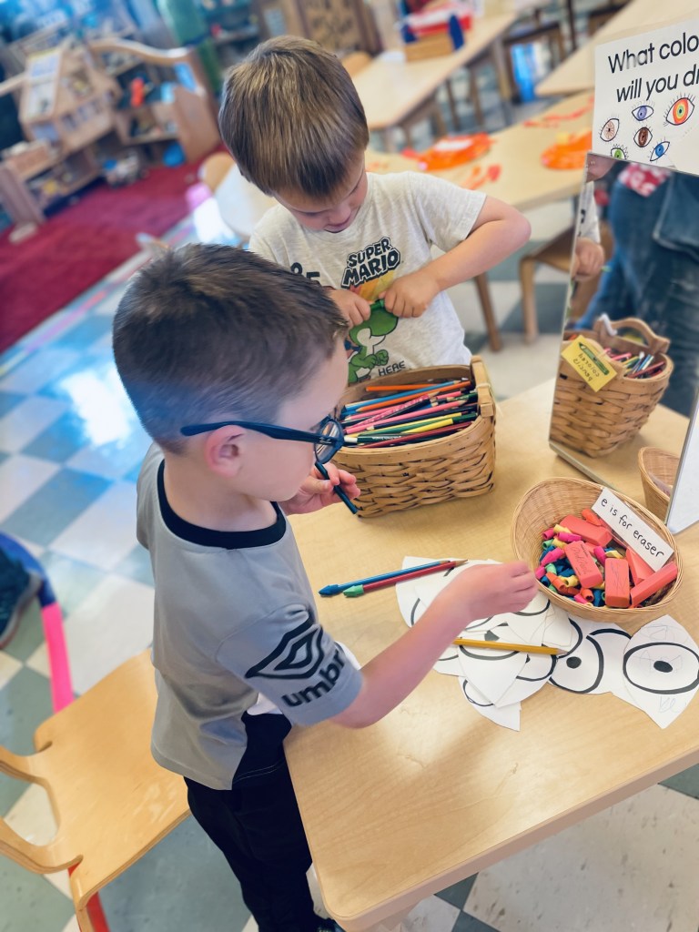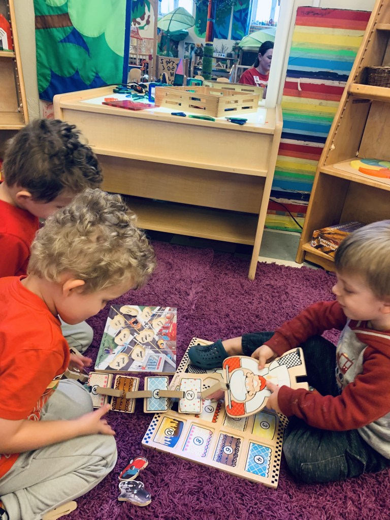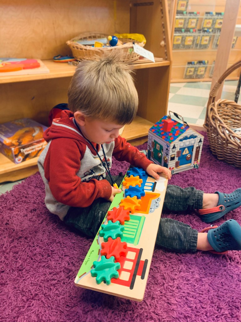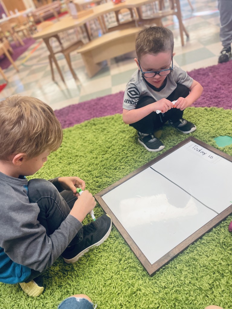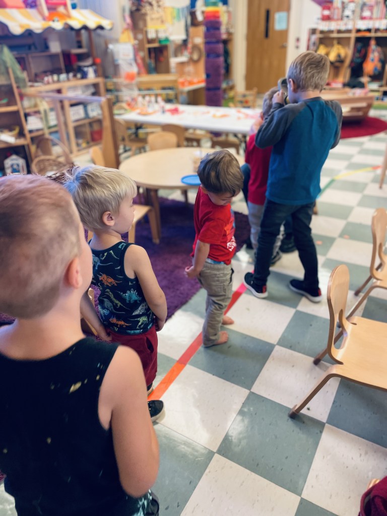 Our Friday “Purple Day” Class finished E week with ease! We played hard inside and out, had a new routine with doing our Journals together and these friends carried their own snack trays from the kitchen to the Big Table! The Puzzle Corner was very busy with friends having success with some of the hardest puzzles we have! Jacob was our Line Leader and an excellent gate rattler!