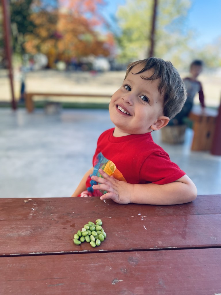 We took the extra edamame and egg noodles outside to finish them up. Once the gummy earthworms were gone, children filled their plastic eggs (and dumped them out) with edamame, noodles or animal crackers.