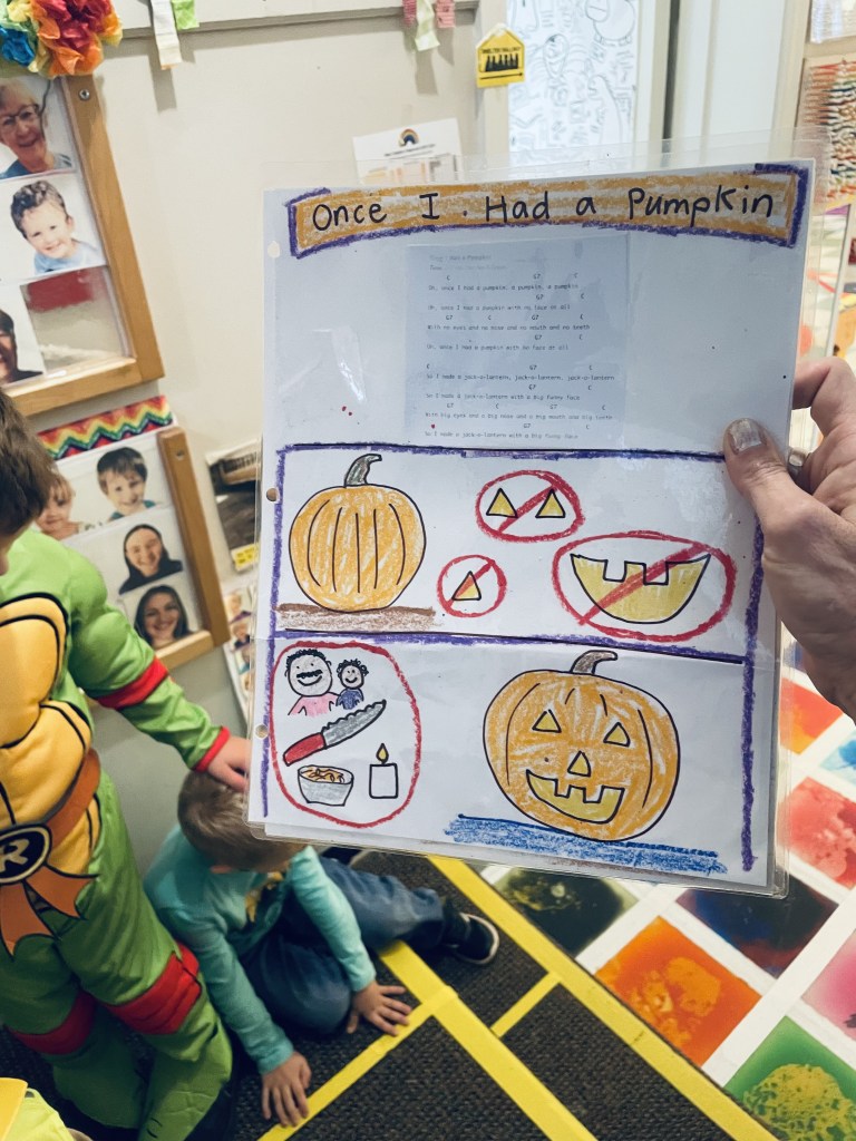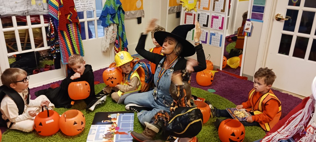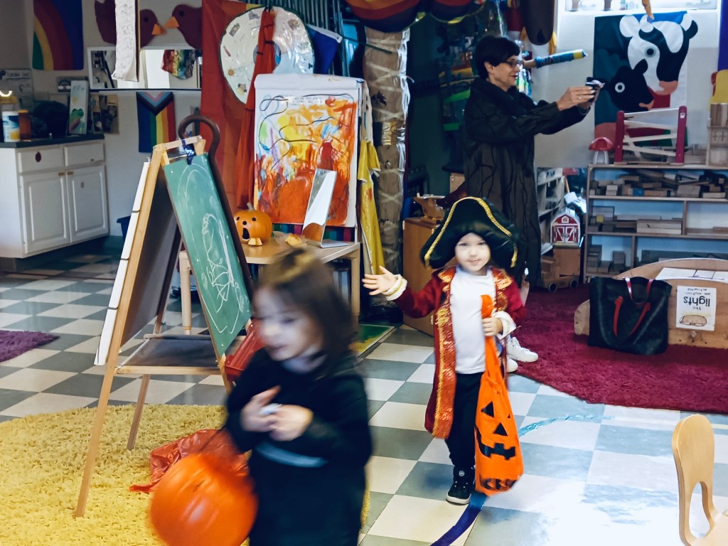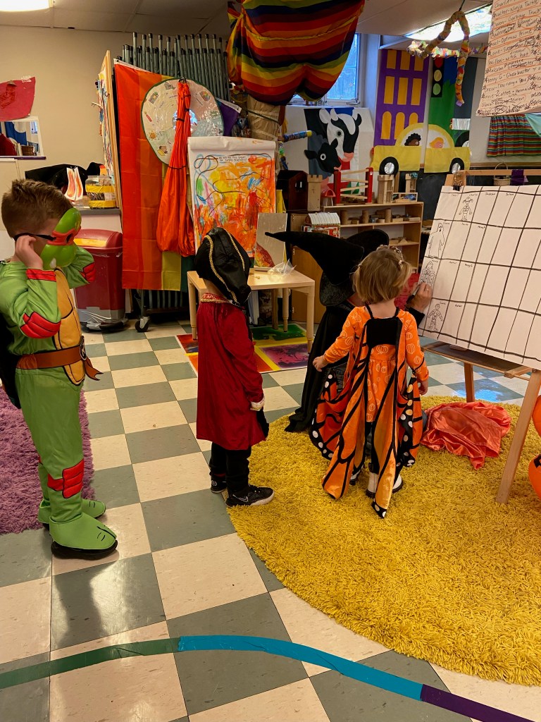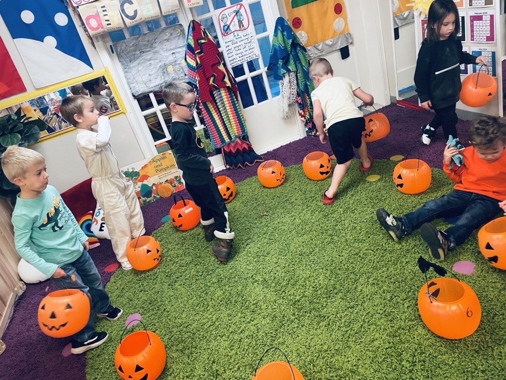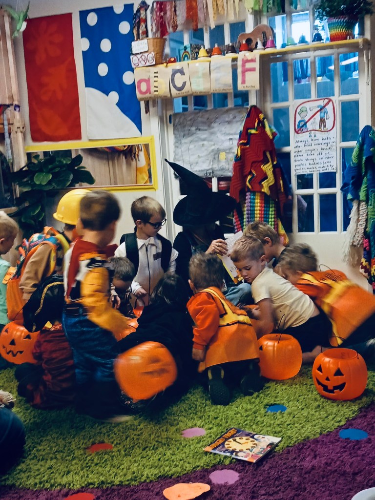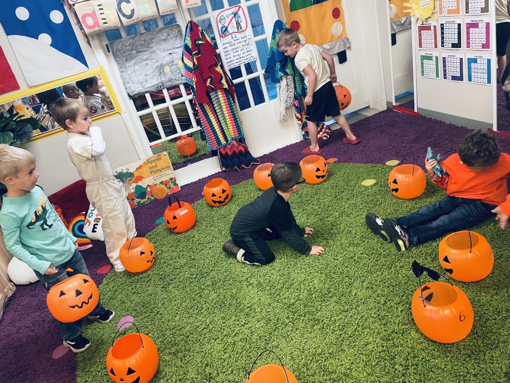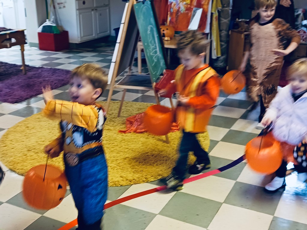 Our Friday “Purple Day” Class started our Costume Days! Every year I remember how simply adding costumes and even the idea of candy or trick or treating ramps up the energy of the room. There were moments of calm focus which were most often around book reading…what a treat. Having more than 13 pumpkins in the room makes everything look festive. With the cold north wind and muddy playground, we opted to stay inside to protect the costumes.