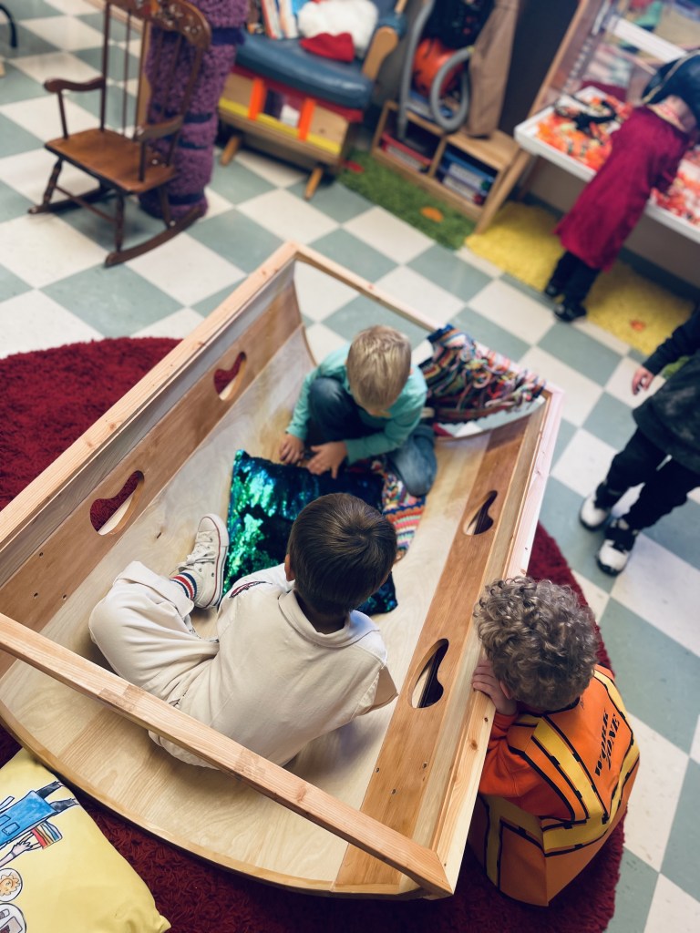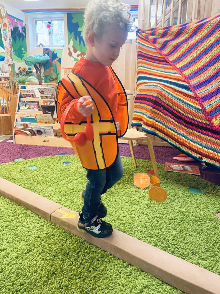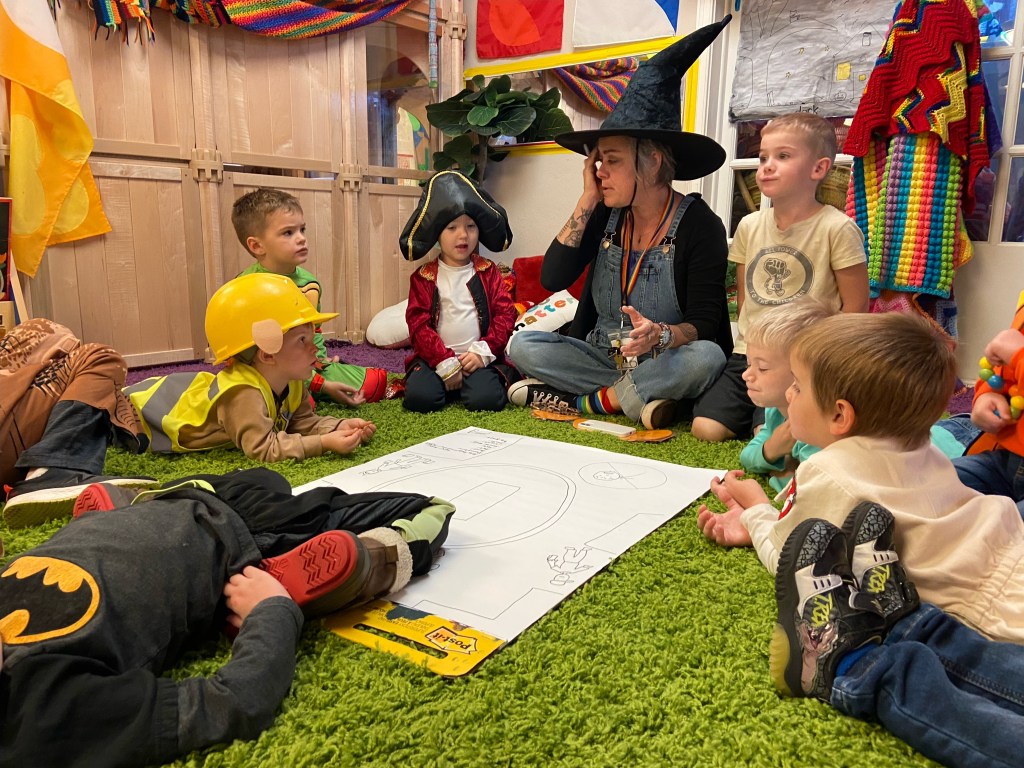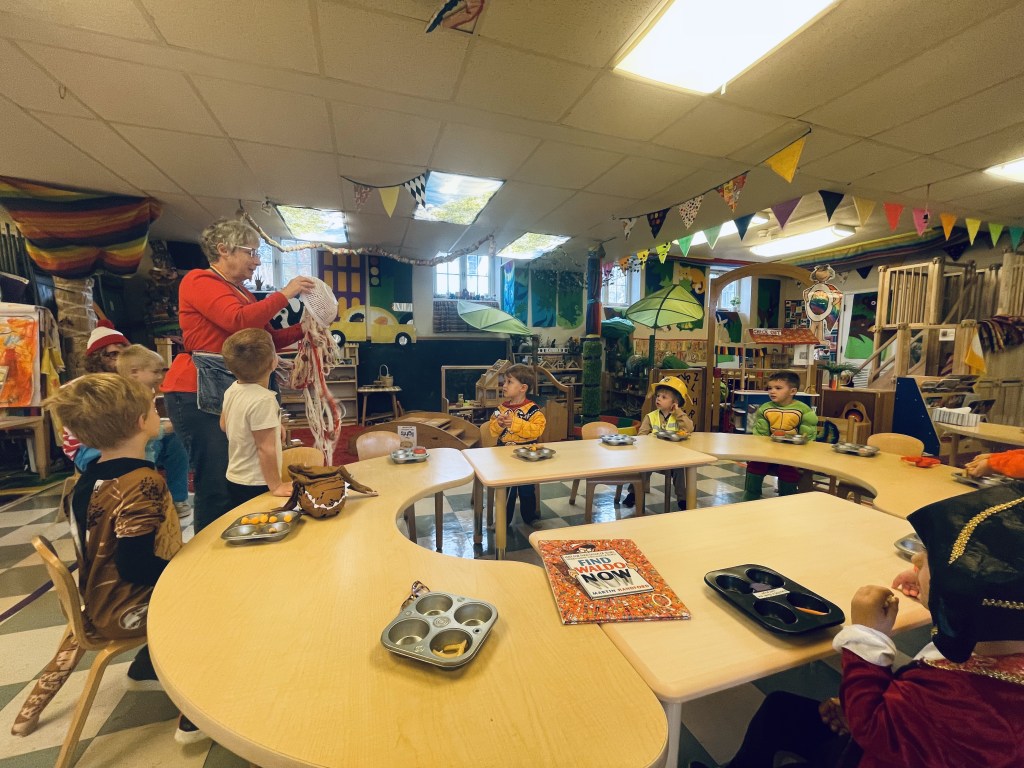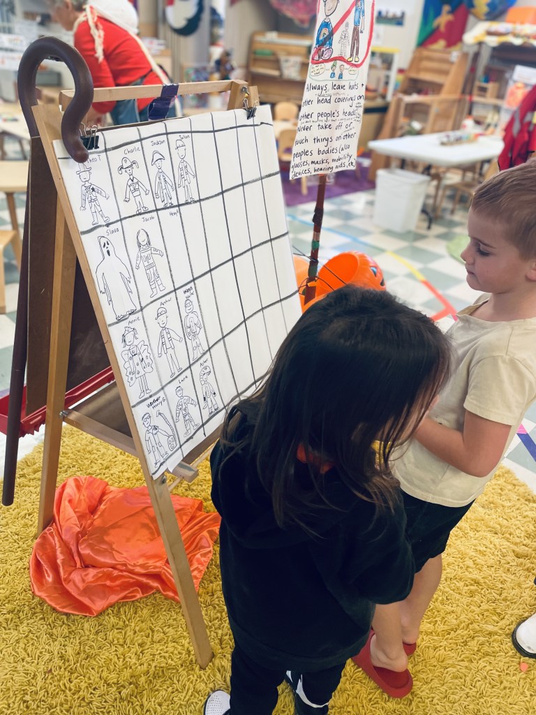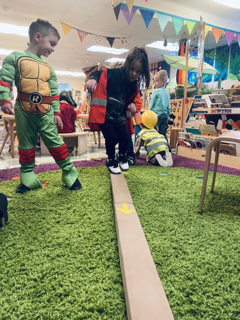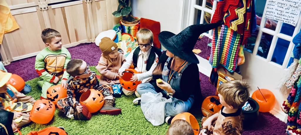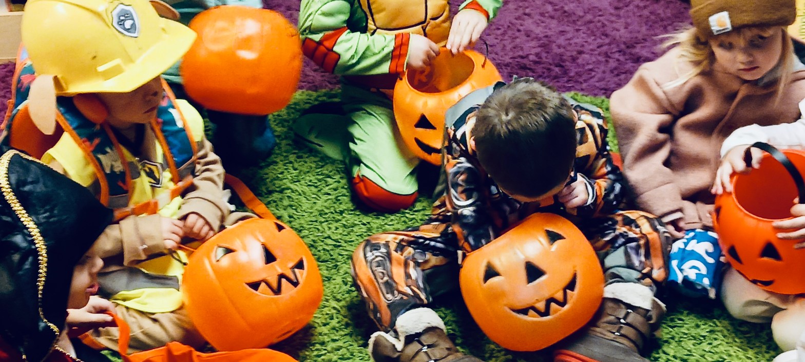 Our Friday “Purple Day” Class started our Costume Days! Every year I remember how simply adding costumes and even the idea of candy or trick or treating ramps up the energy of the room. There were moments of calm focus which were most often around book reading…what a treat. Having more than 13 pumpkins in the room makes everything look festive. With the cold north wind and muddy playground, we opted to stay inside to protect the costumes.