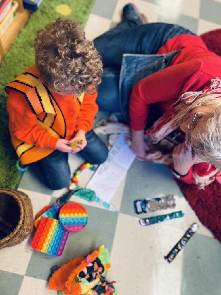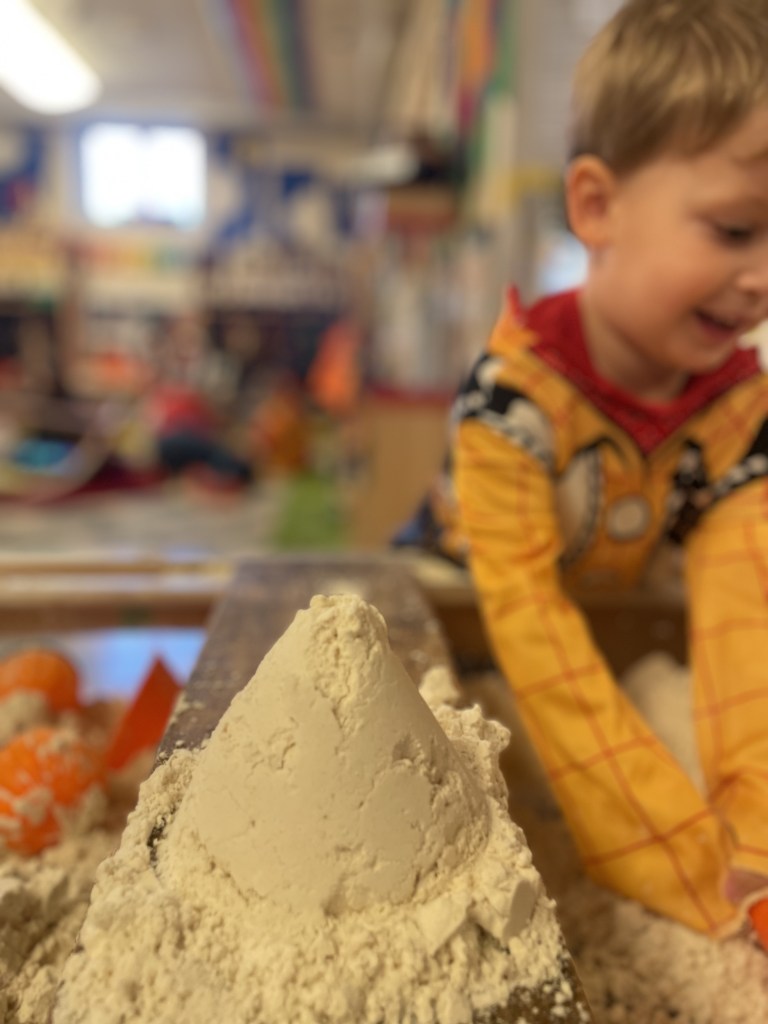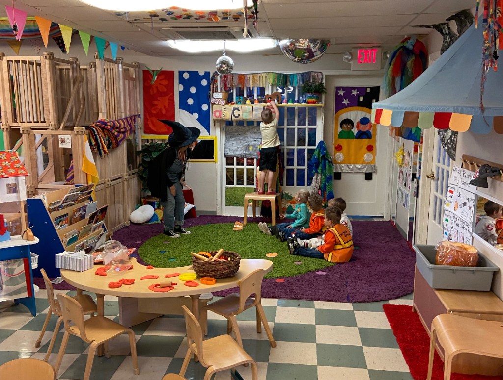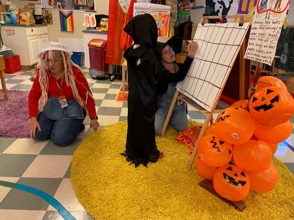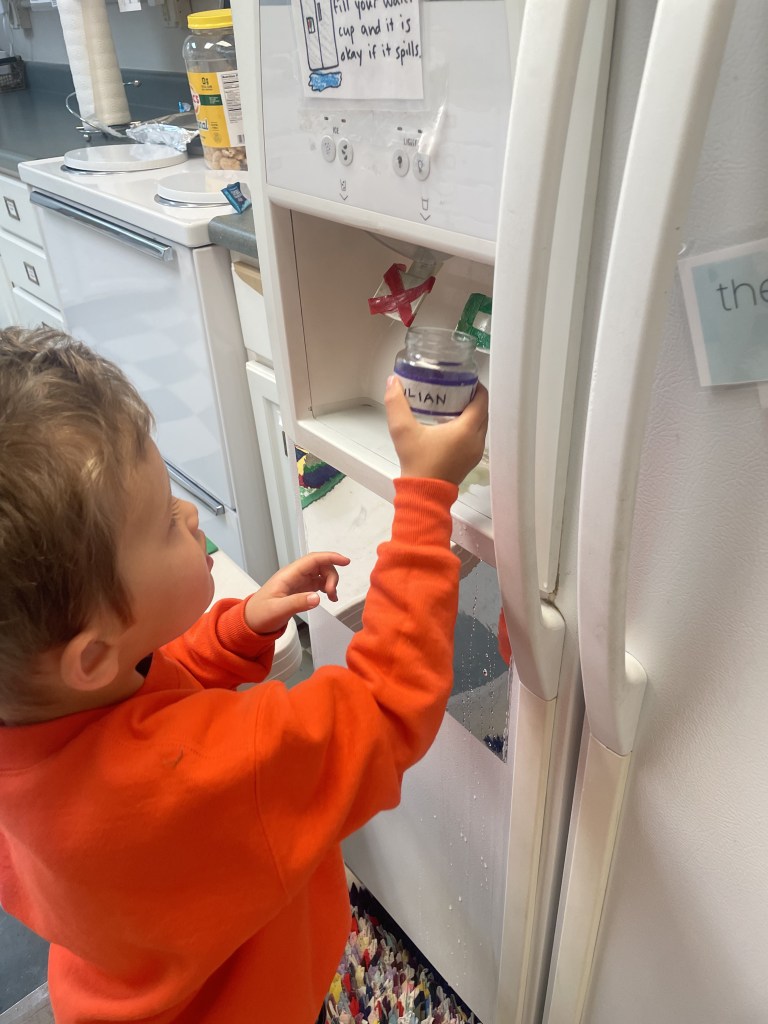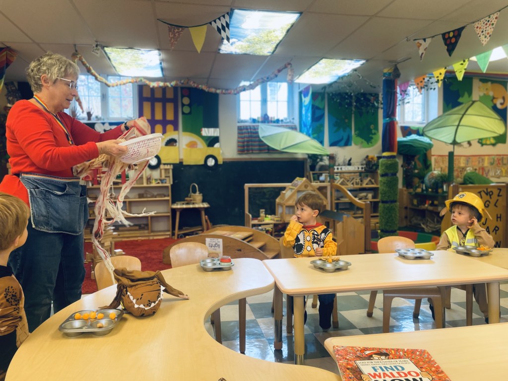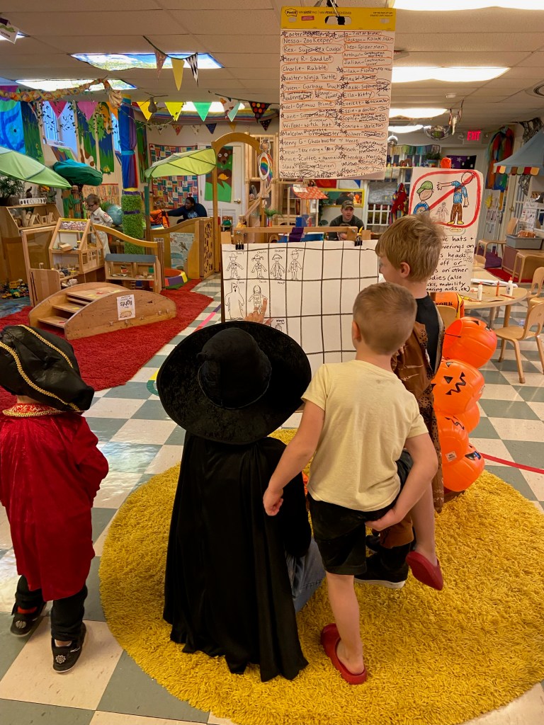 By now this is an iconic preschool costume that a couple of preschoolers remembered from last year. So fun! Ms Brenda told the story of her costume during Snack Time. We had a warm snack today that “smelled like lunch” and “smelled so good” in the oven: fish sticks and french fries! Thank you, Arthur and Julian! The Snack Store was BUSY: