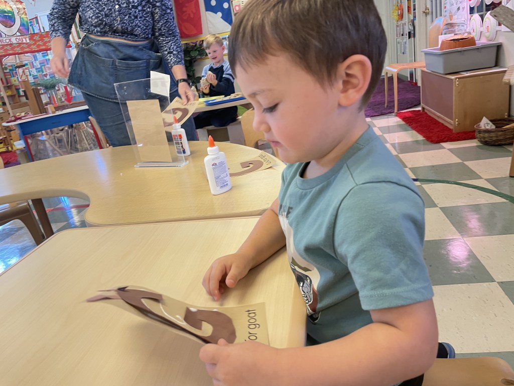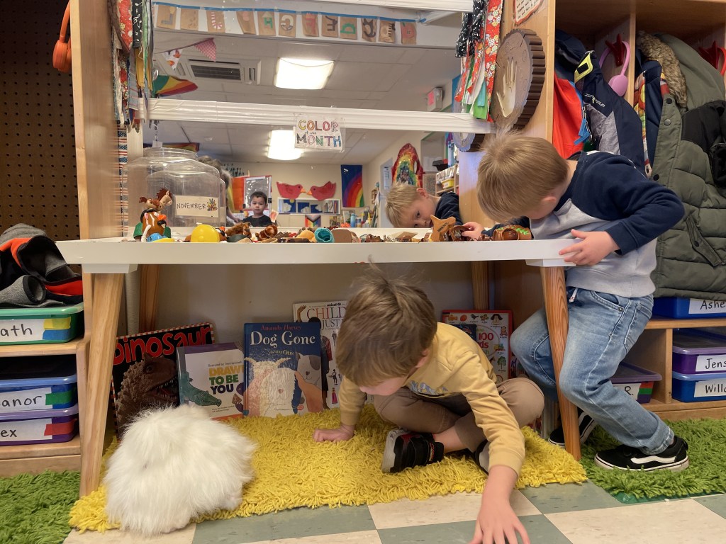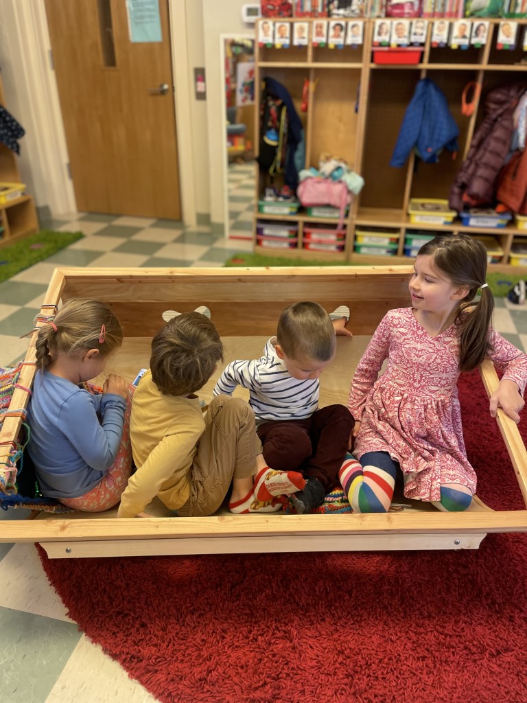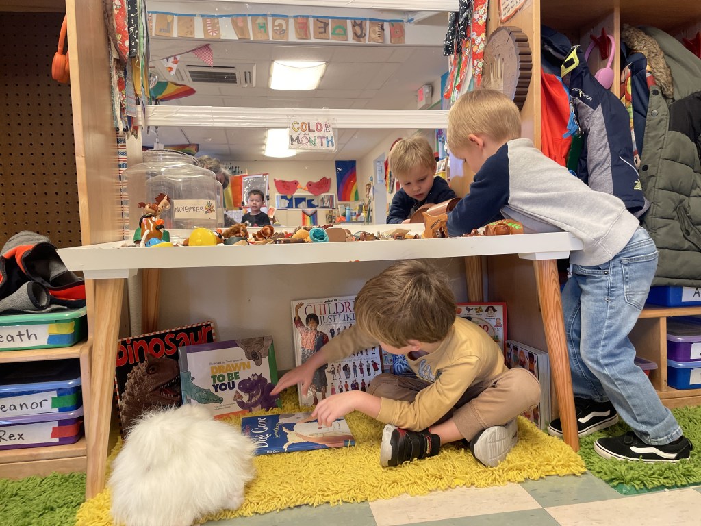We had friends playing with the tiny brown things, the brown things in the tub table and making things with her brown collage supplies. Someone found the new reading nook UNDER the Tiny Things table. So cozy!