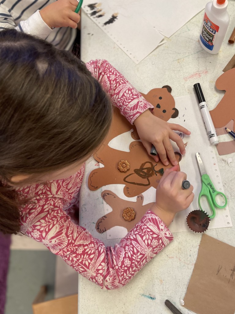There were a variety of techniques: shark teeth zig zags, up and down scribbles, coloring in the pre drawn grass shape and individual blades of grass.