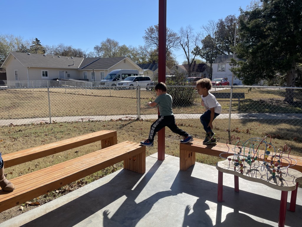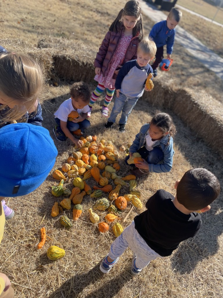 Thank you to Grandma Brenda and Grandpa Kelven for bringing them to us from Stutzman Garden Center! There was a lot of play with our gourds in hand as well…rolling on the pumpkin, building the playhouse, walking on benches and more.