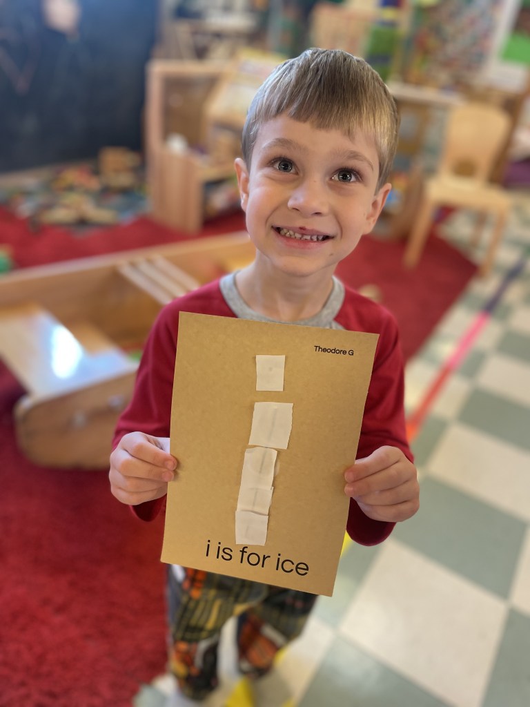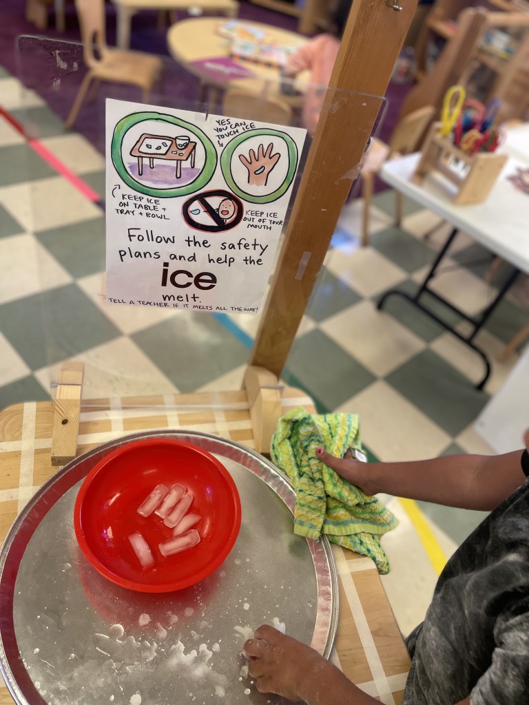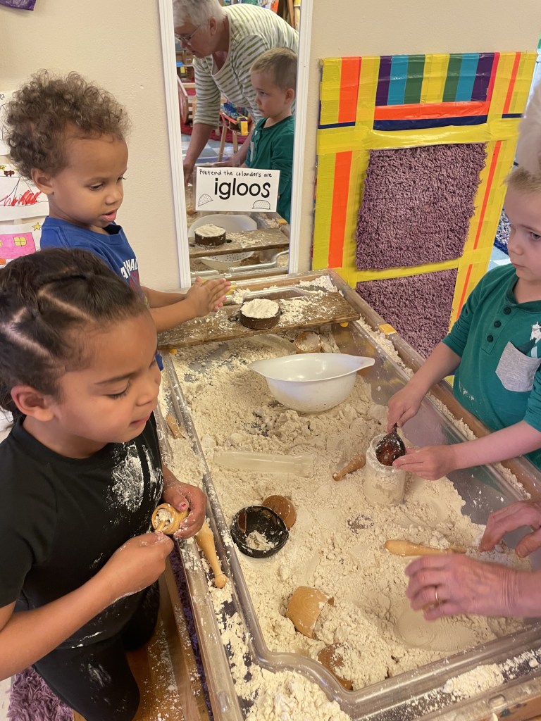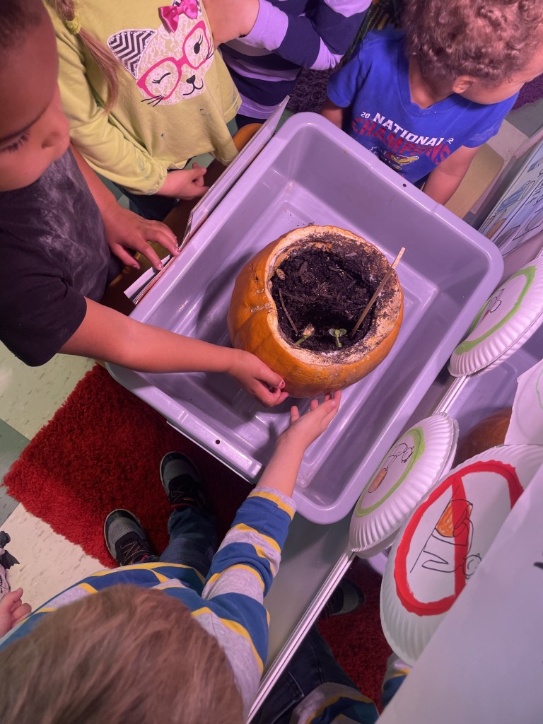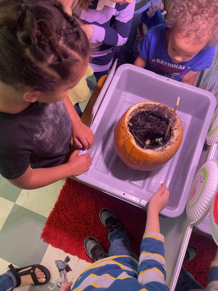 Our Tuesday “Yellow Day” Class was all together today…one little sister turned three so she stayed on her own for the first time. Ms Kristin counted 13 pillows so everyone could have one at Circle Time. We honored I Week with instruments, ice, igloos and inches. The Dirt Pumpkin has changed since we were together last as well.