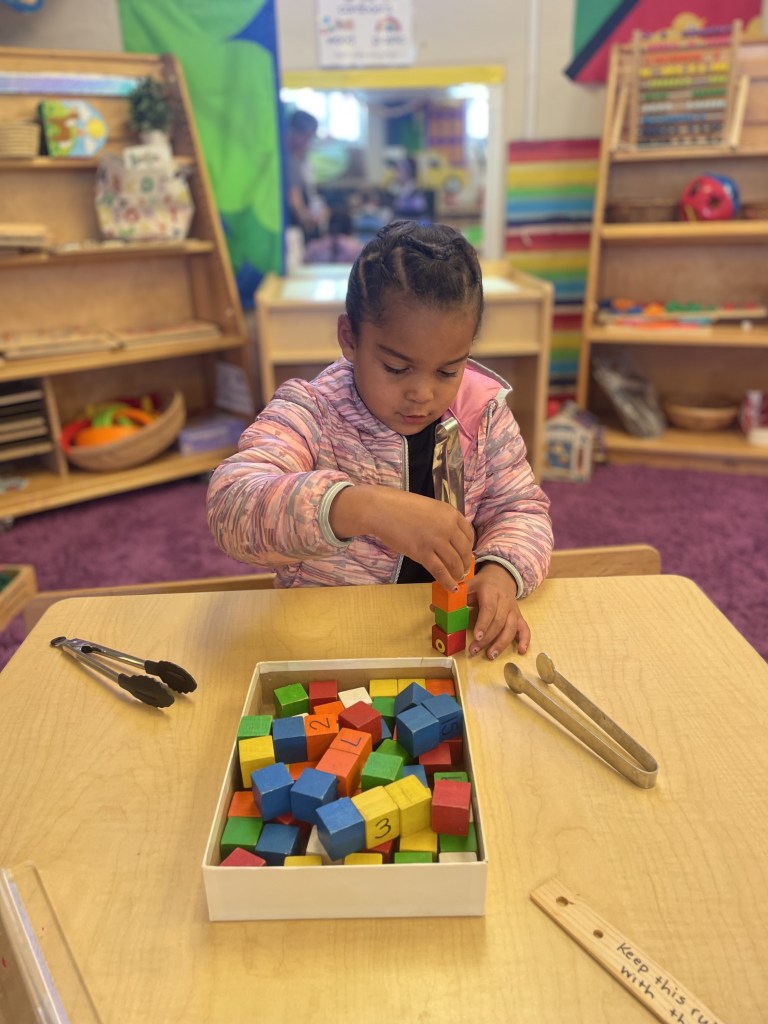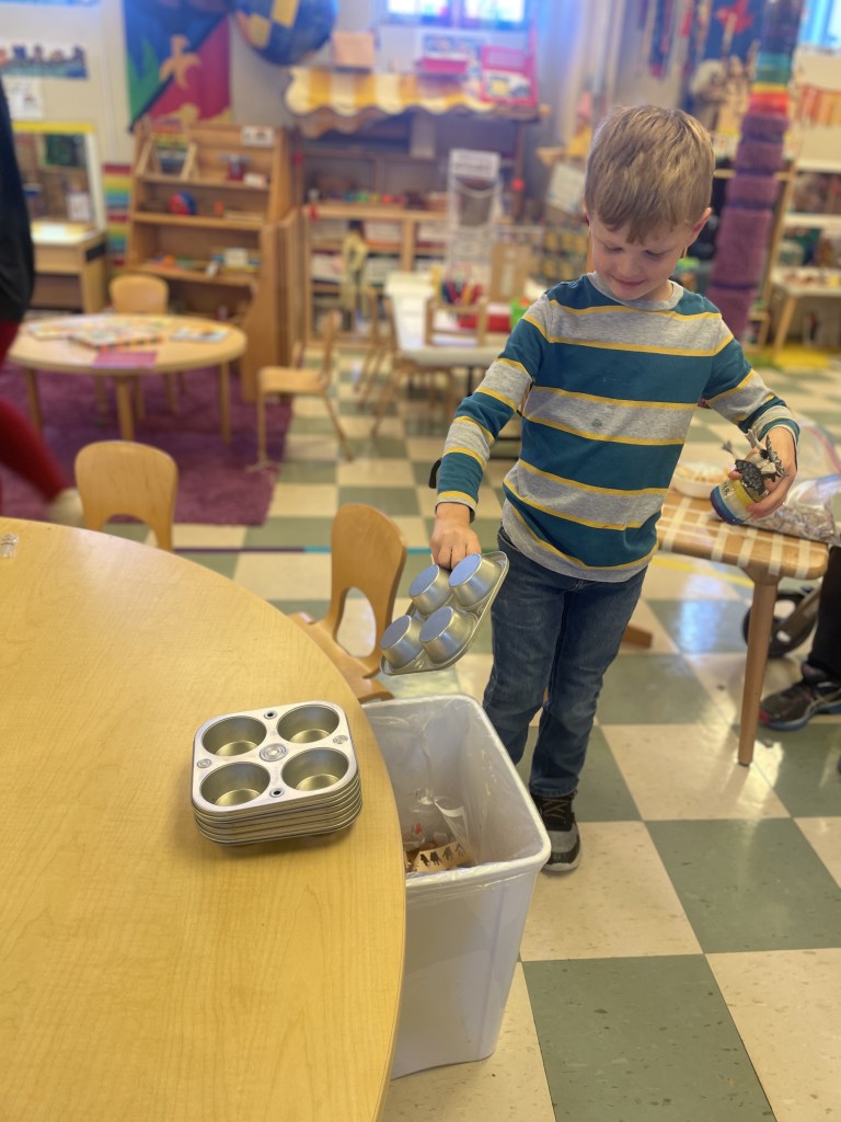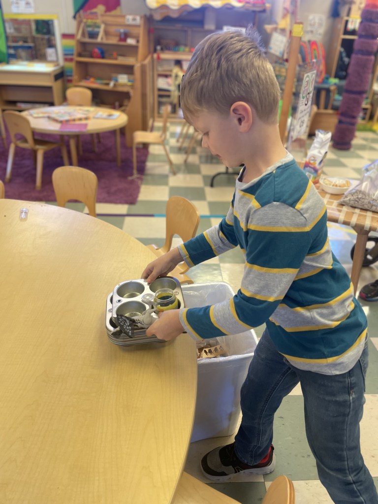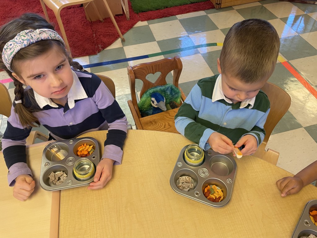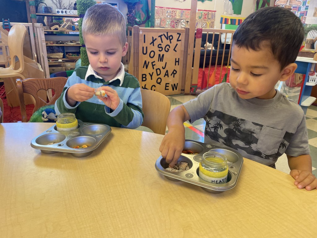 Cheese sticks, rainbow goldfish and Muddy Buddies (some friends know it as Puppy Chow, but we called them Muddy Buddies like the friends who brought them). Thank you, Essie and Sophie! We practiced dumping and stacking our trays today too!