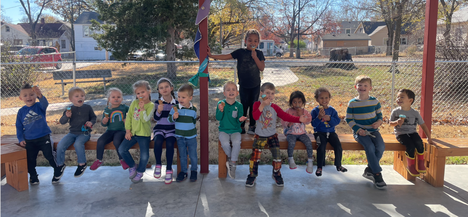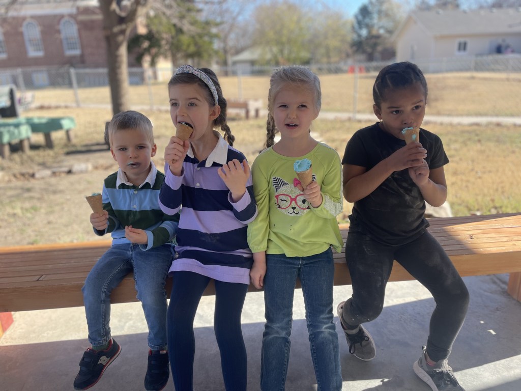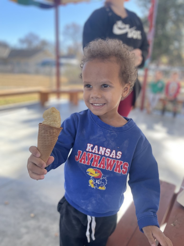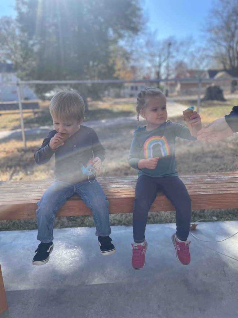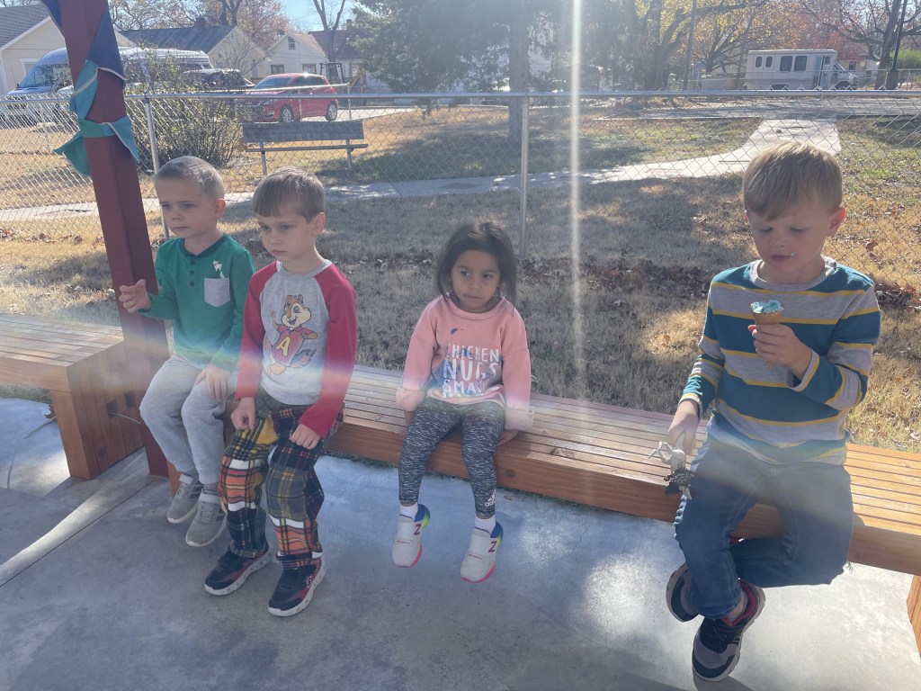 On a bench! Asher brought ice cream and ice cream cones for a birthday treat today. What a treat for a warm November day! (We also had ice cream shaped rice krispie treats for friends who don’t eat ice cream.)