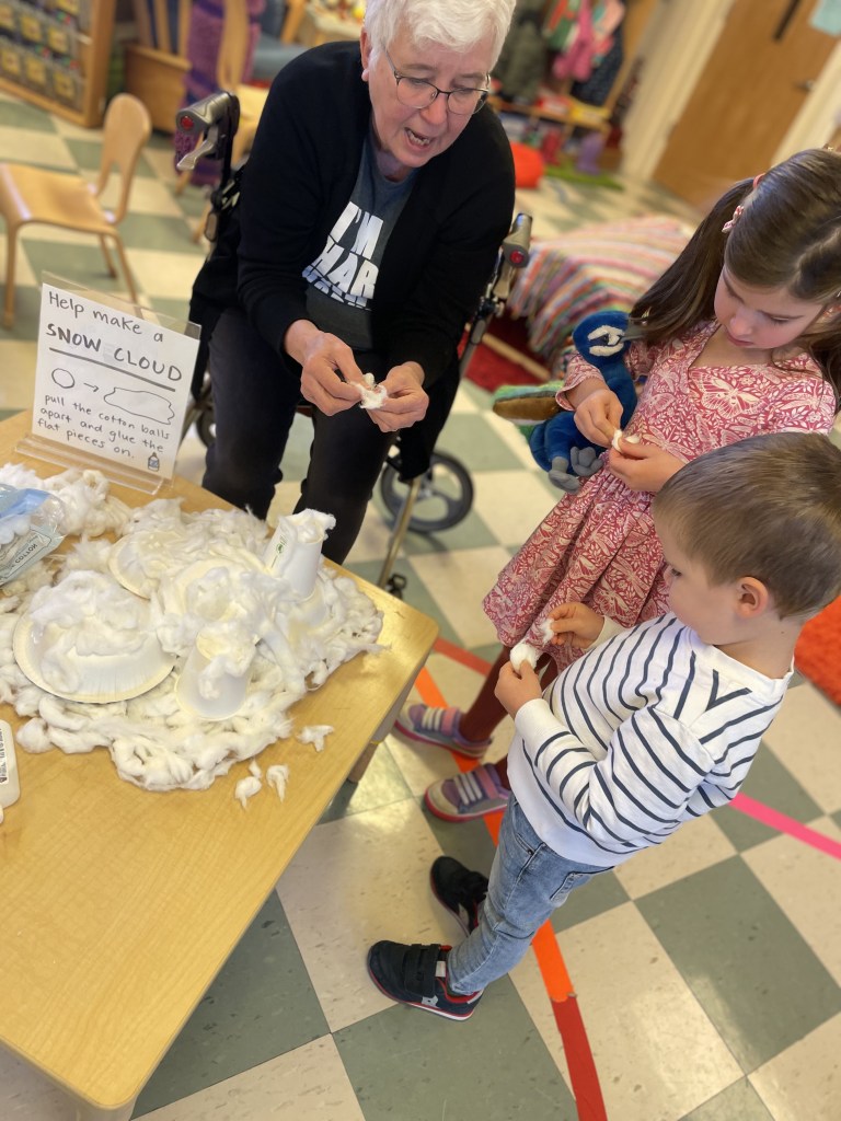Everyone at school today and yesterday answered yes to this question….that is 31 yeses so far. We have a few friends who were gone and we will wait to see what their answers are when they return. During our Snow Talk, we also had our big snow cloud pass over the imaginary towns we live in or near.